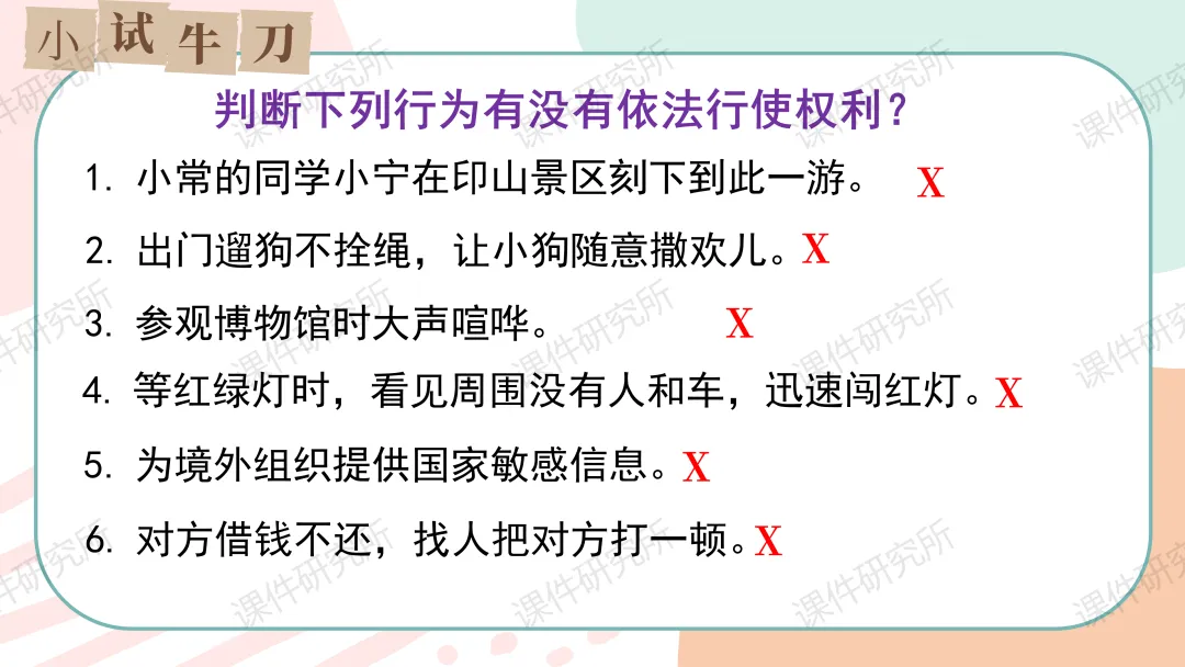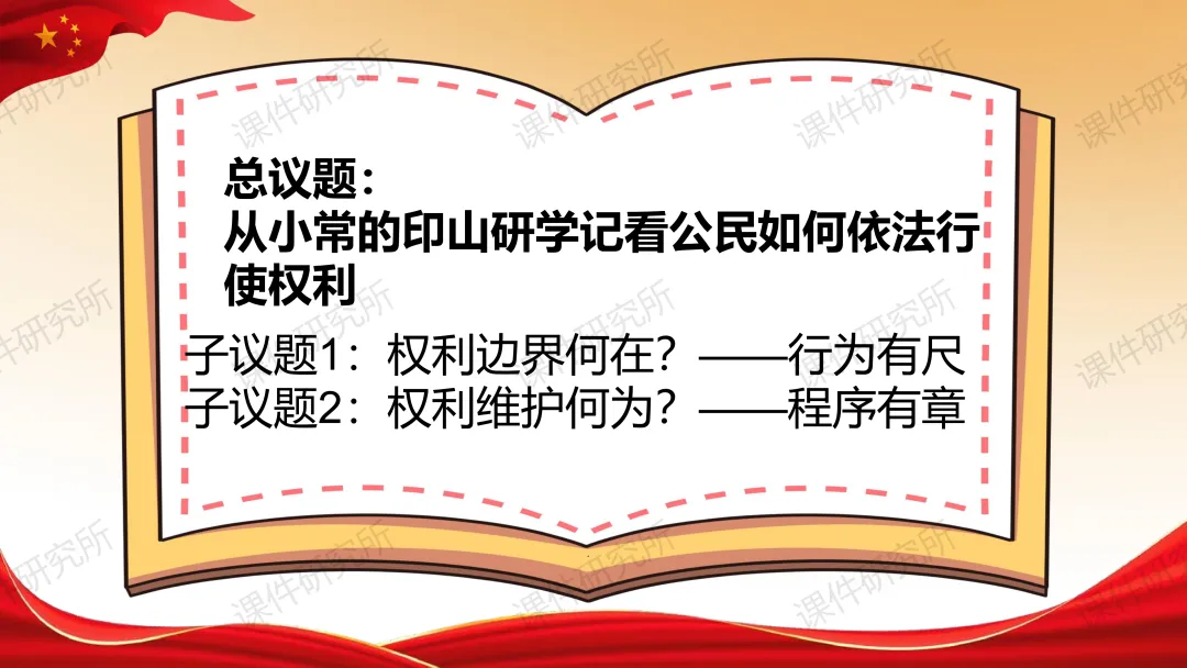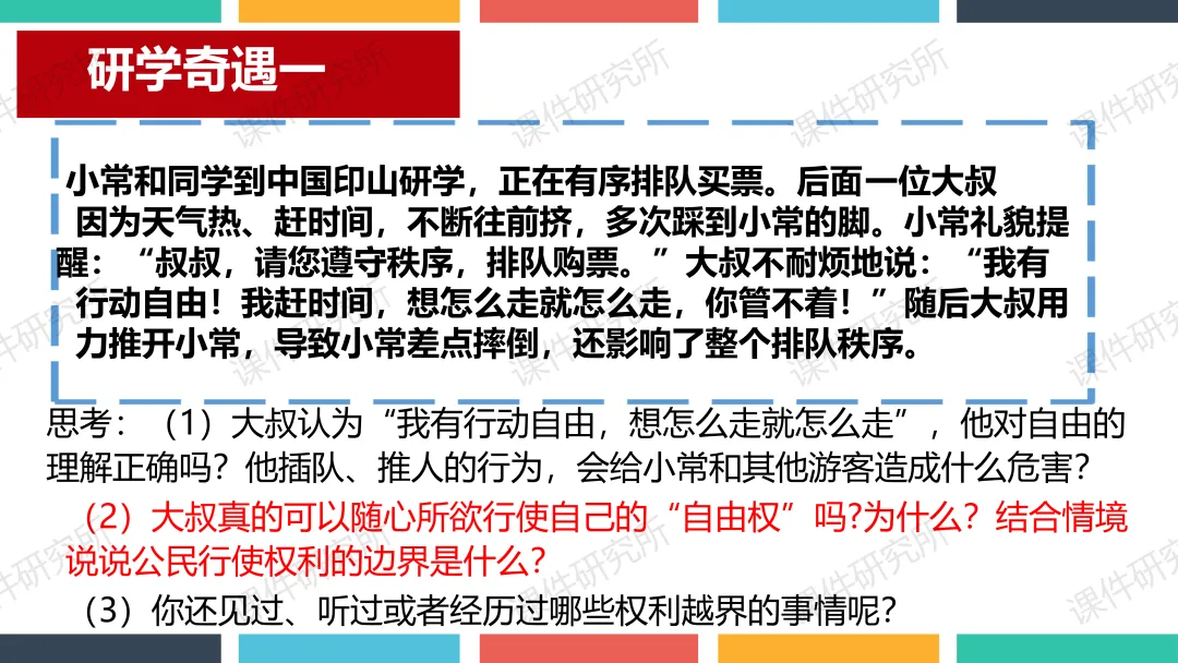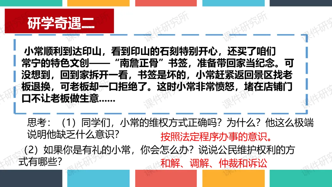 老师原本的课件就结合了本地素材,以小常同学印山研学为总线索,设两个子议题展开。结合真实情境案例,通过提问、判断、小组活动、情景剧等形式,讲解行使权利的边界和维权程序,搭配表格梳理维权方式,层层递进落实核心素养,突出重难点。