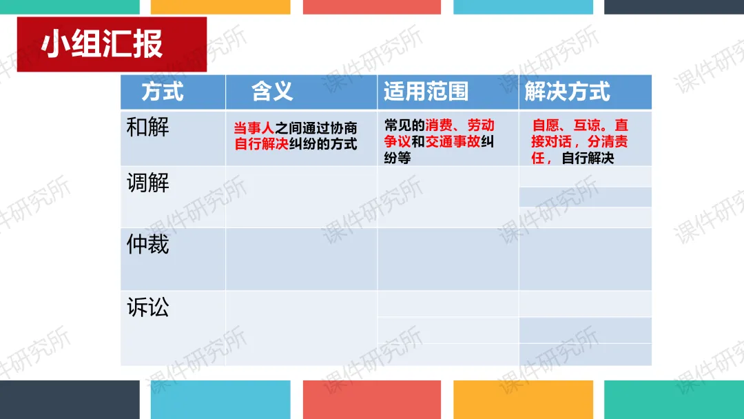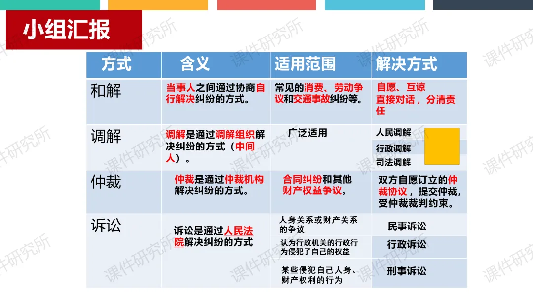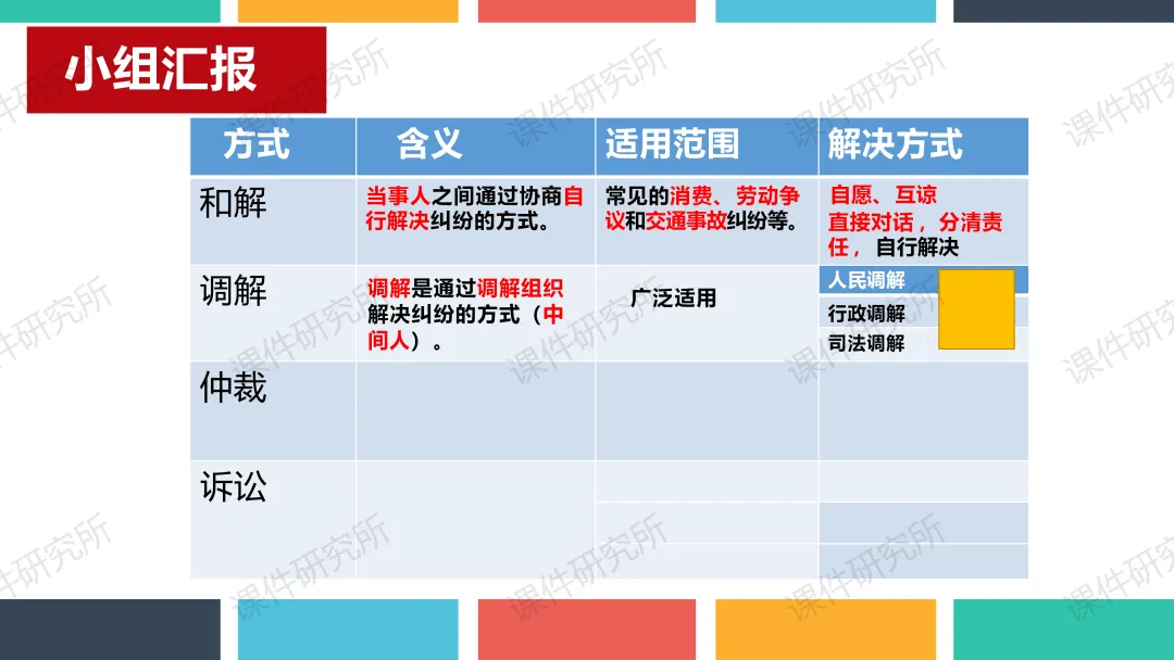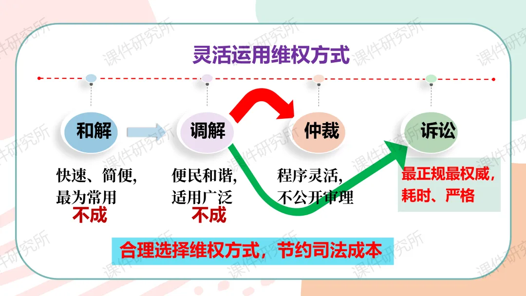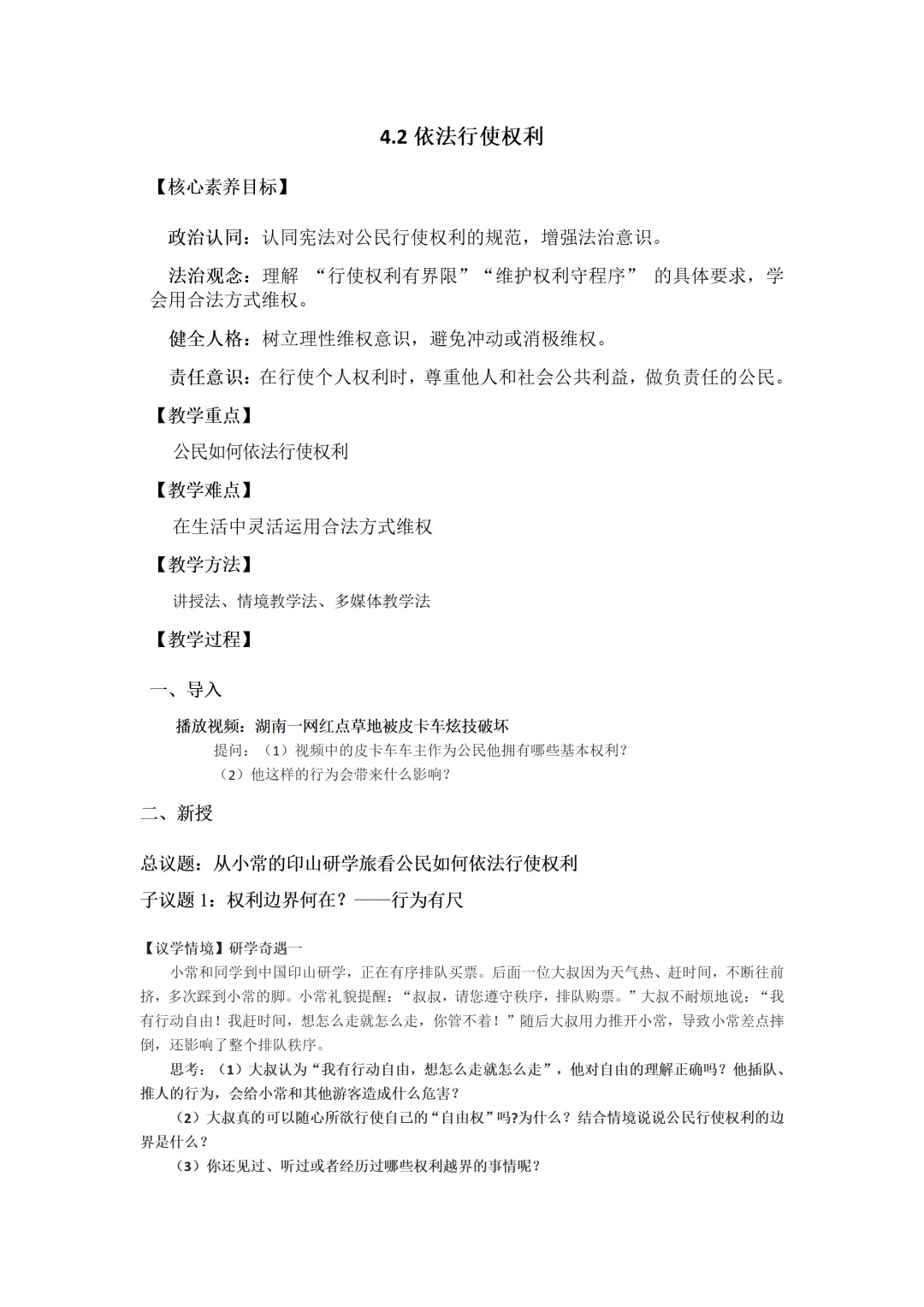 老师原本的课件就结合了本地素材,以小常同学印山研学为总线索,设两个子议题展开。结合真实情境案例,通过提问、判断、小组活动、情景剧等形式,讲解行使权利的边界和维权程序,搭配表格梳理维权方式,层层递进落实核心素养,突出重难点。