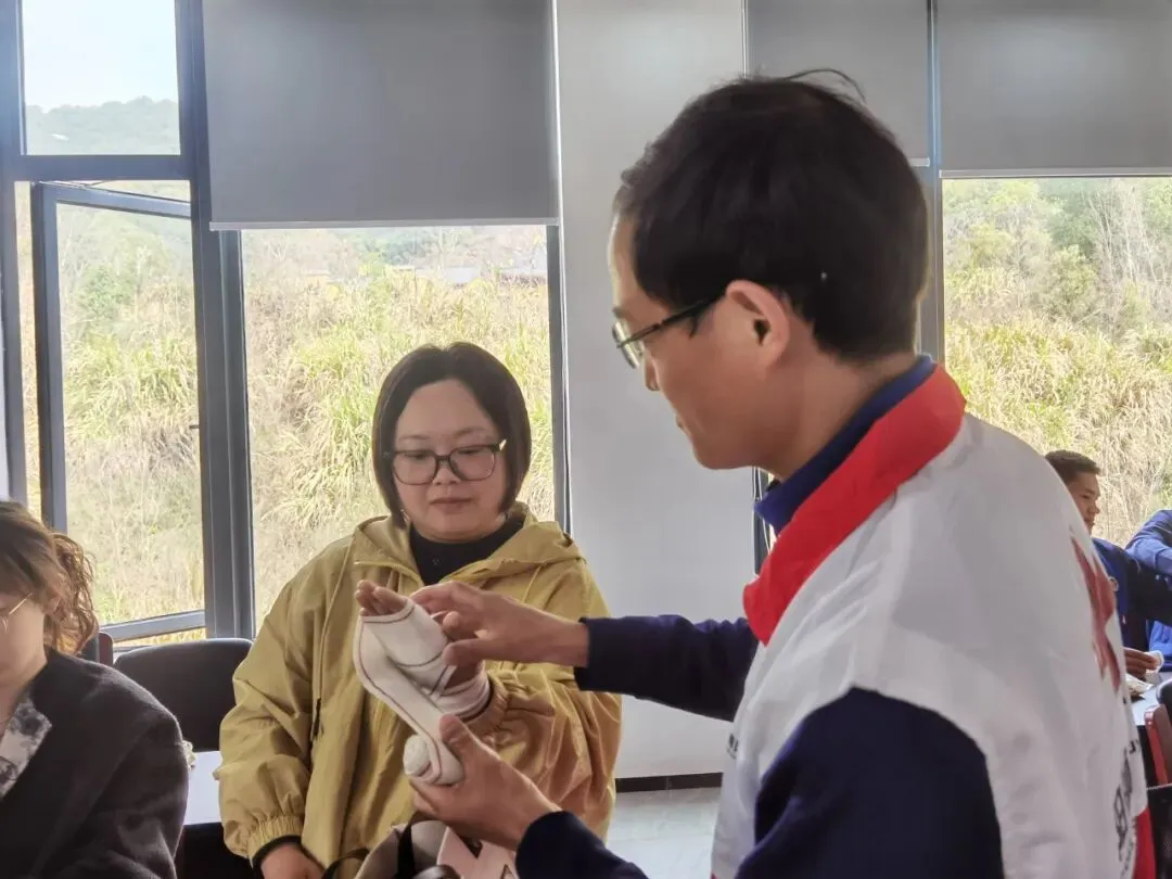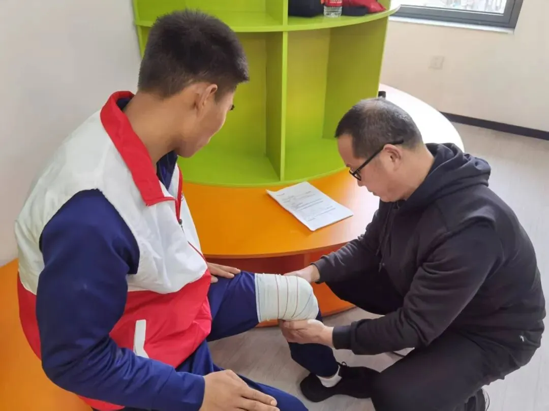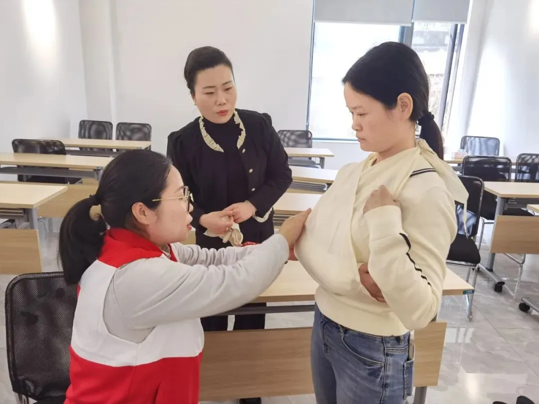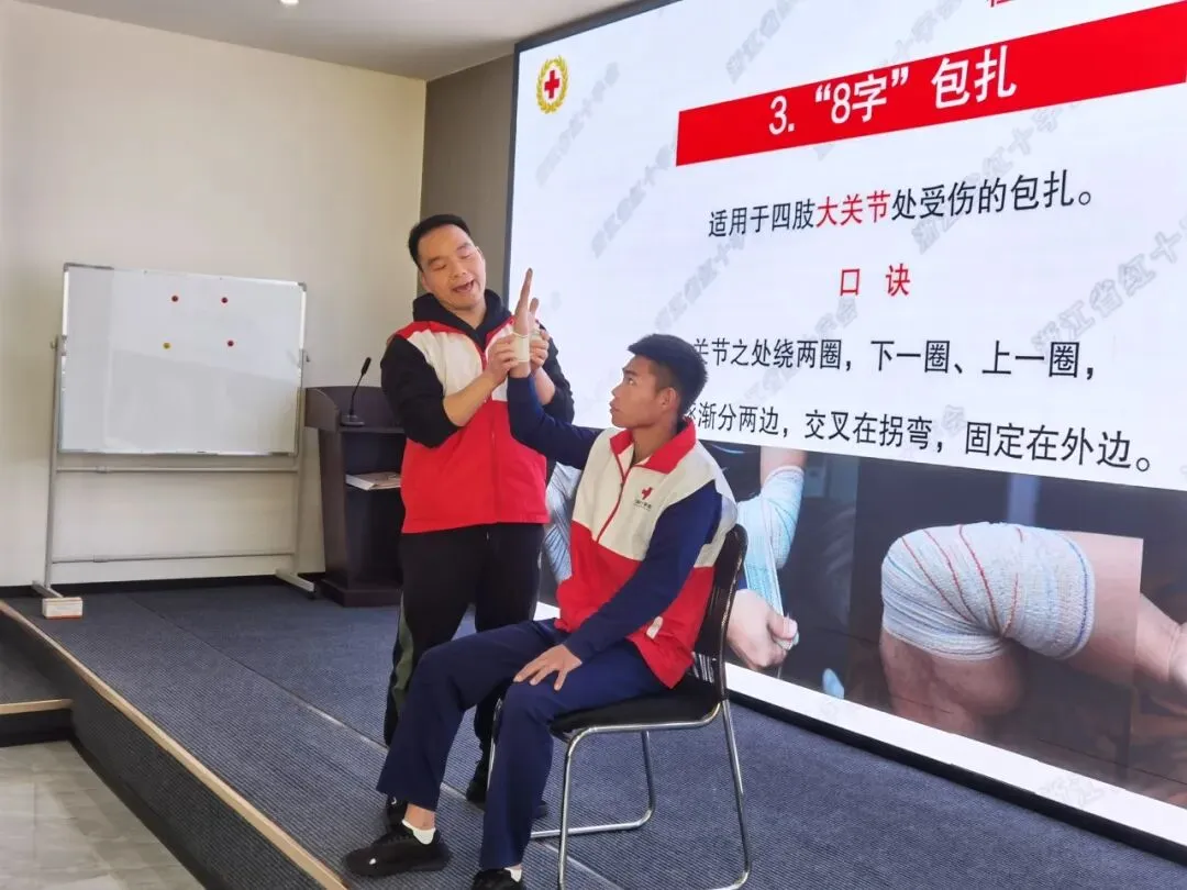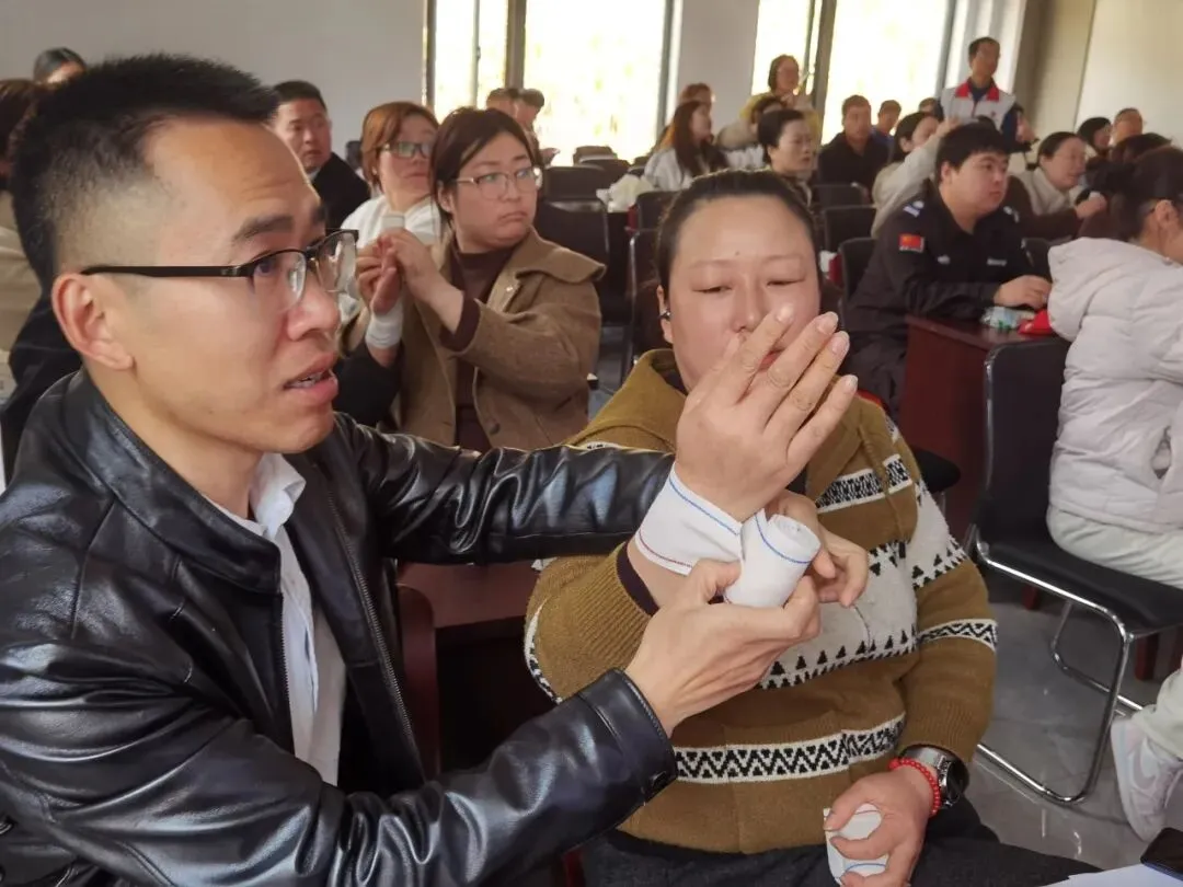 朱医生围绕头部、四肢、关节等不同部位的包扎方法,细致讲解绷带、三角巾的使用技巧,从环形包扎、螺旋包扎到三角巾头部包扎、四肢包扎等,学员们手把手实操演练,助教一对一纠错指导。