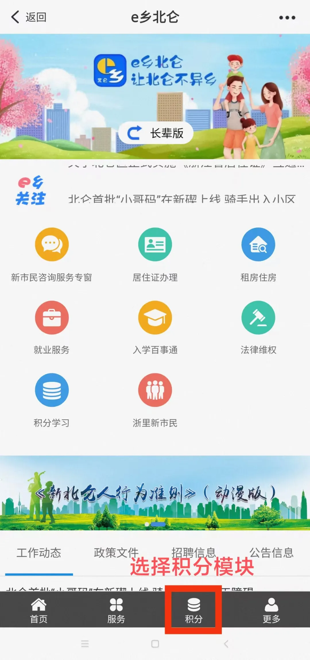 进入e乡北仑后,点击底部“积分”,并进行实名信息认证,通过后可进入积分模块,开始积分学习课件的考试。
