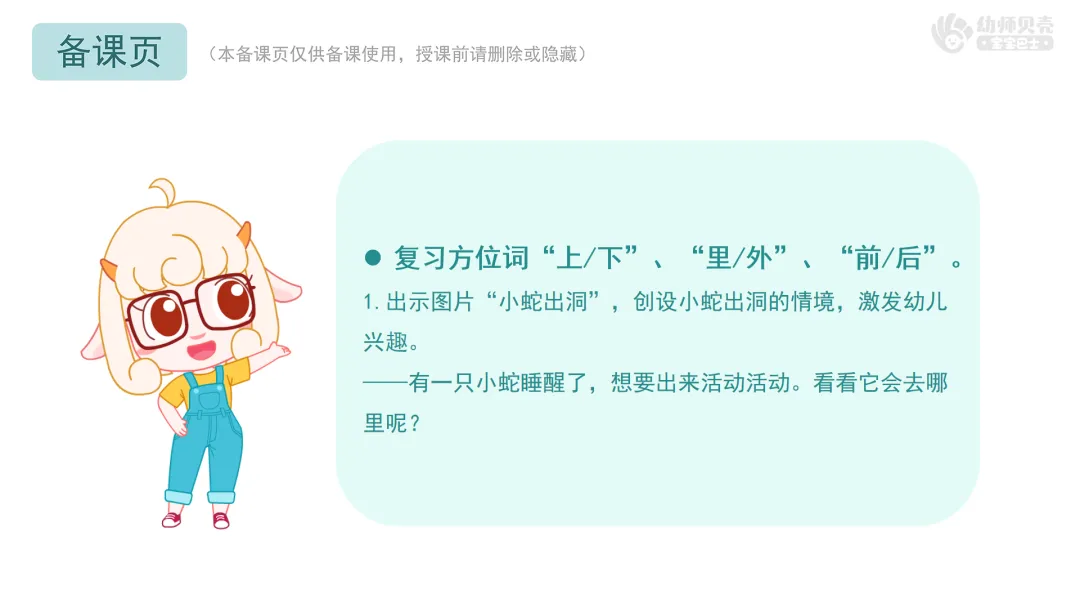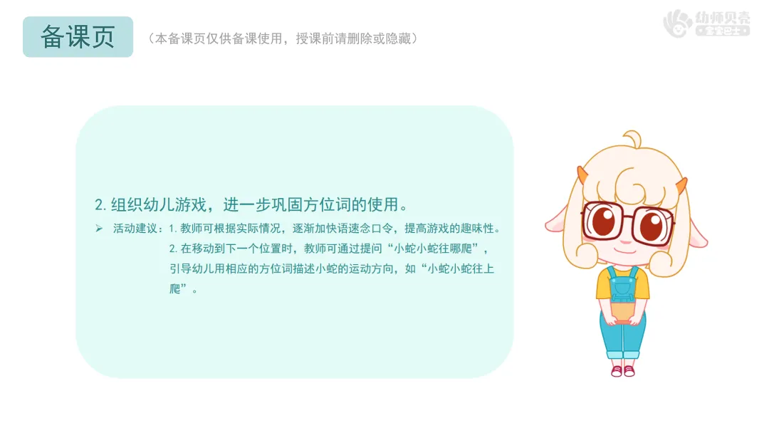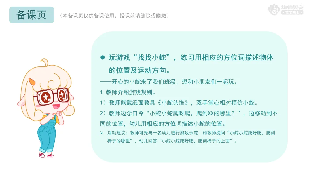 Ø活动建议:教师可先与一名幼儿进行游戏示范,如教师提问“小蛇小蛇爬呀爬,爬到椅子的哪里”,幼儿回答“小蛇小蛇爬呀爬,爬到椅子的上面”。
