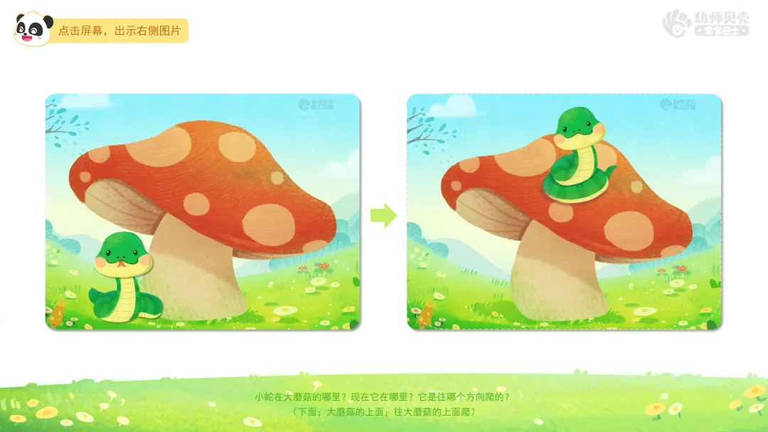 ——小蛇在大蘑菇的哪里?现在它在哪里?它是往哪个方向爬的?(下面;大蘑菇的上面;往大蘑菇的上面爬)