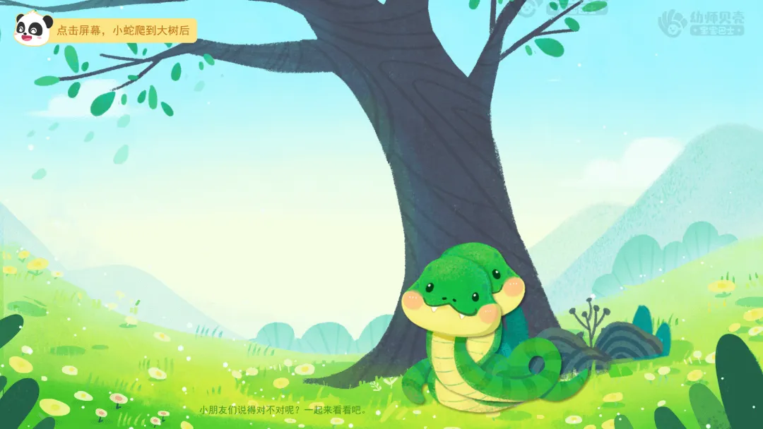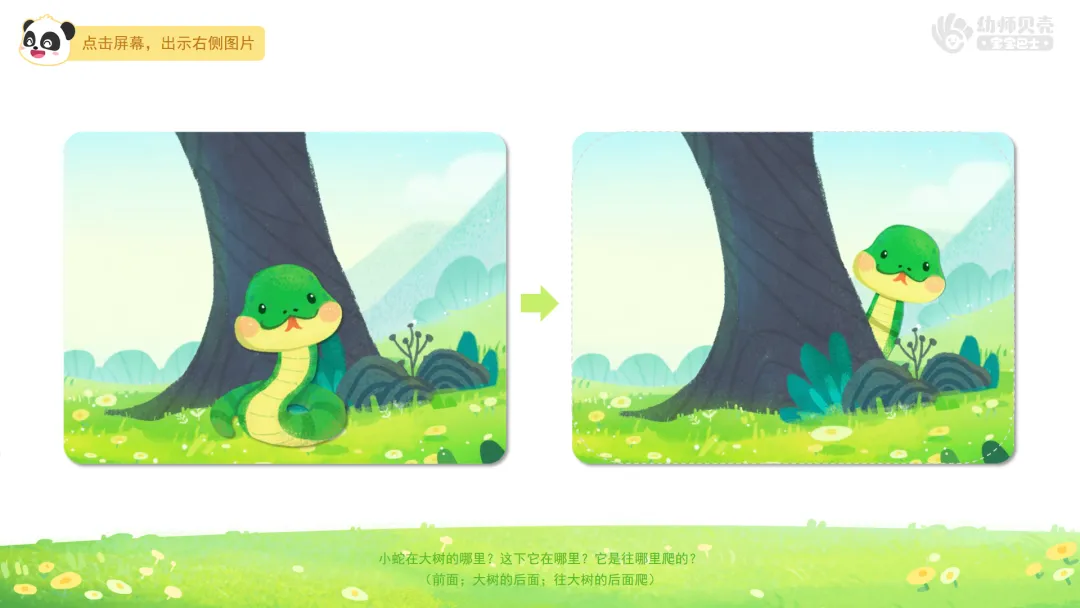 ——小蛇在大树的哪里?这下它在哪里?它是往哪里爬的?(前面;大树的后面;往大树的后面爬)