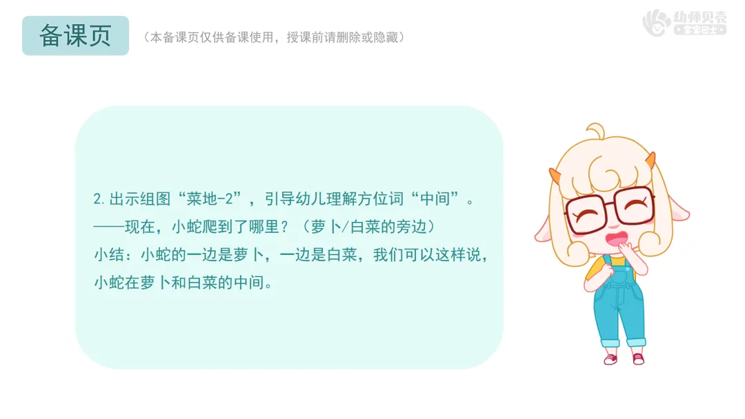 小结:小蛇的一边是萝卜,一边是白菜,我们可以这样说,小蛇在萝卜和白菜的中间。