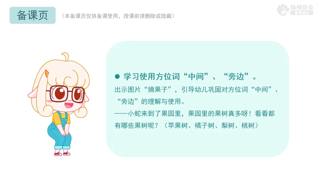出示图片“摘果子”,引导幼儿巩固对方位词“中间”、“旁边”的理解和使用。