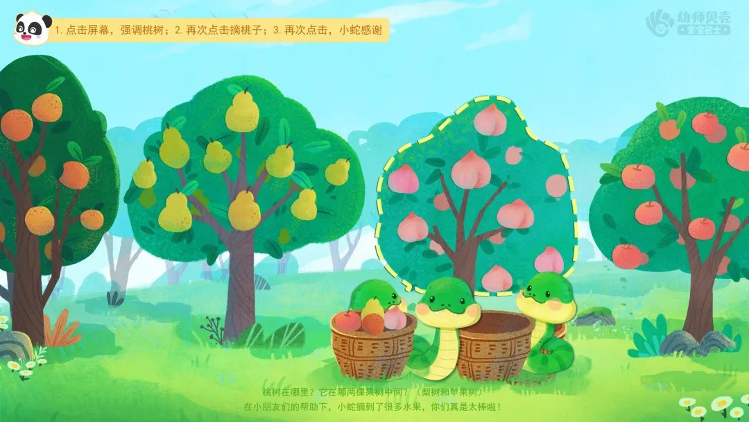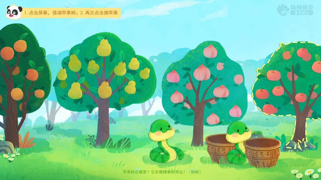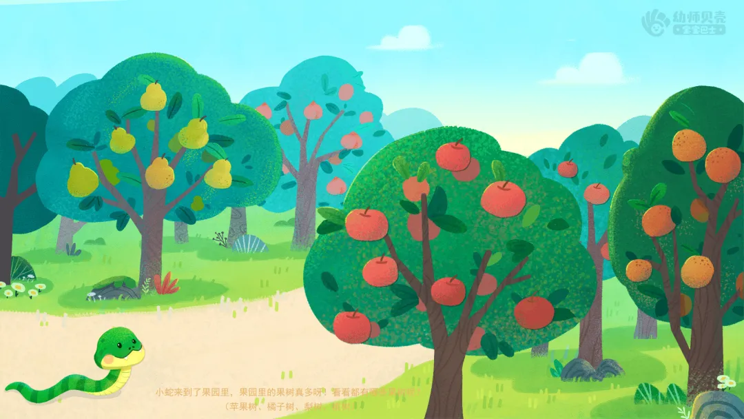 ——小蛇来到了果园里,果园里的果树真多呀!看看都有哪些果树呢?(苹果树、橘子树、梨树、桃树)