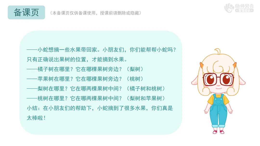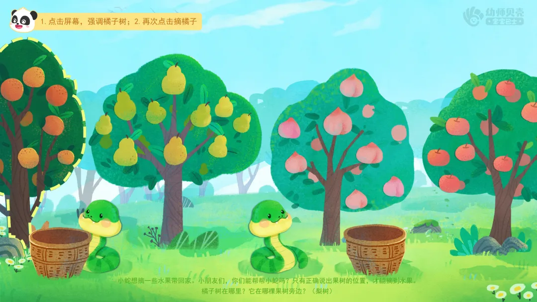 ——小蛇想摘一些水果带回家。小朋友们,你们能帮帮小蛇吗?只有正确说出果树的位置,才能摘到水果。