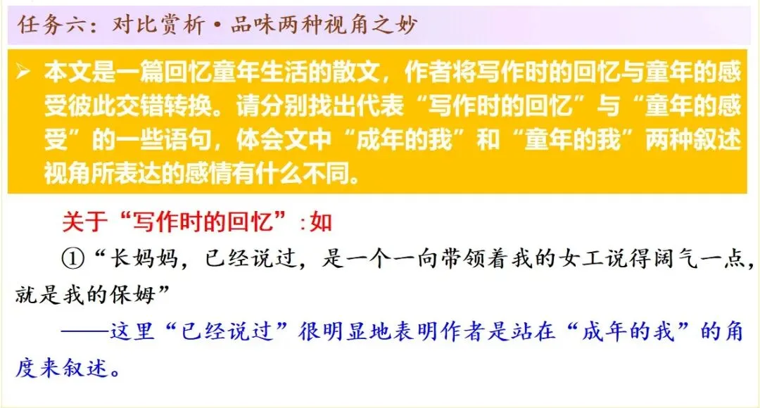 4.理解回忆性散文中,作者将写作时的回忆与童年的感受彼此交错转换的特点