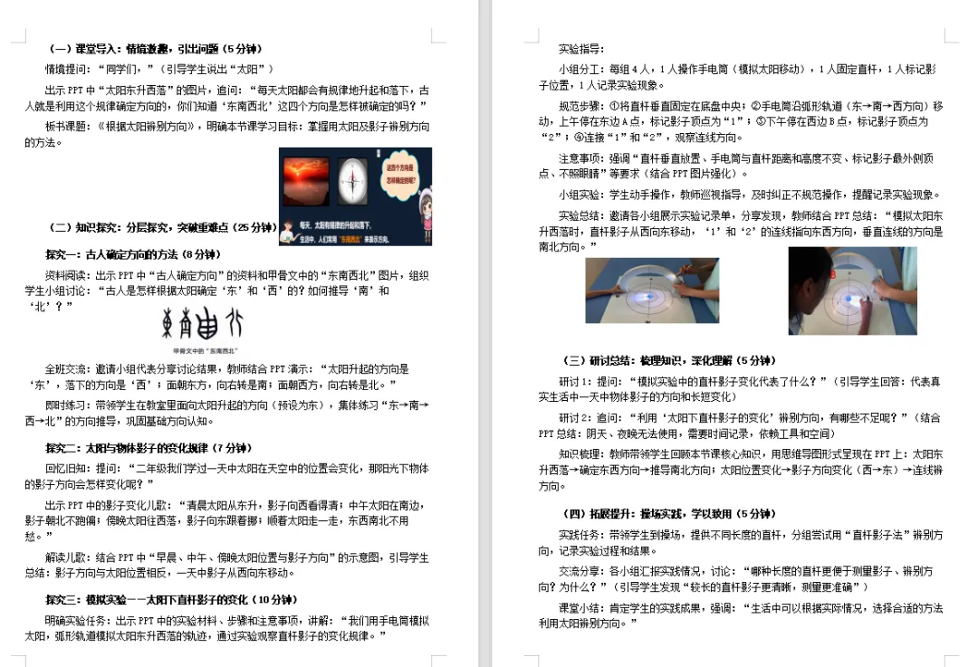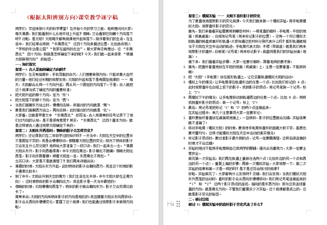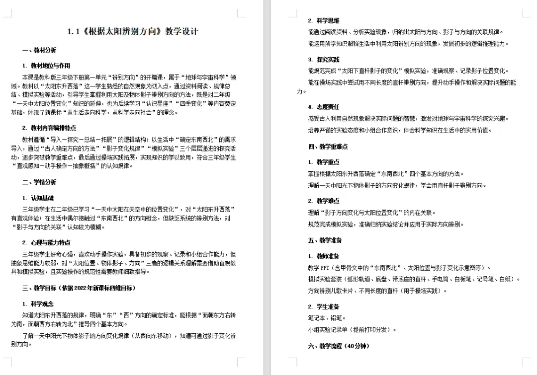 >【科学教案课件】新教材教科版版小学科学三年级下册全册文本配套课件(含逐字稿+反思)第1课《根据太阳辨别方向》