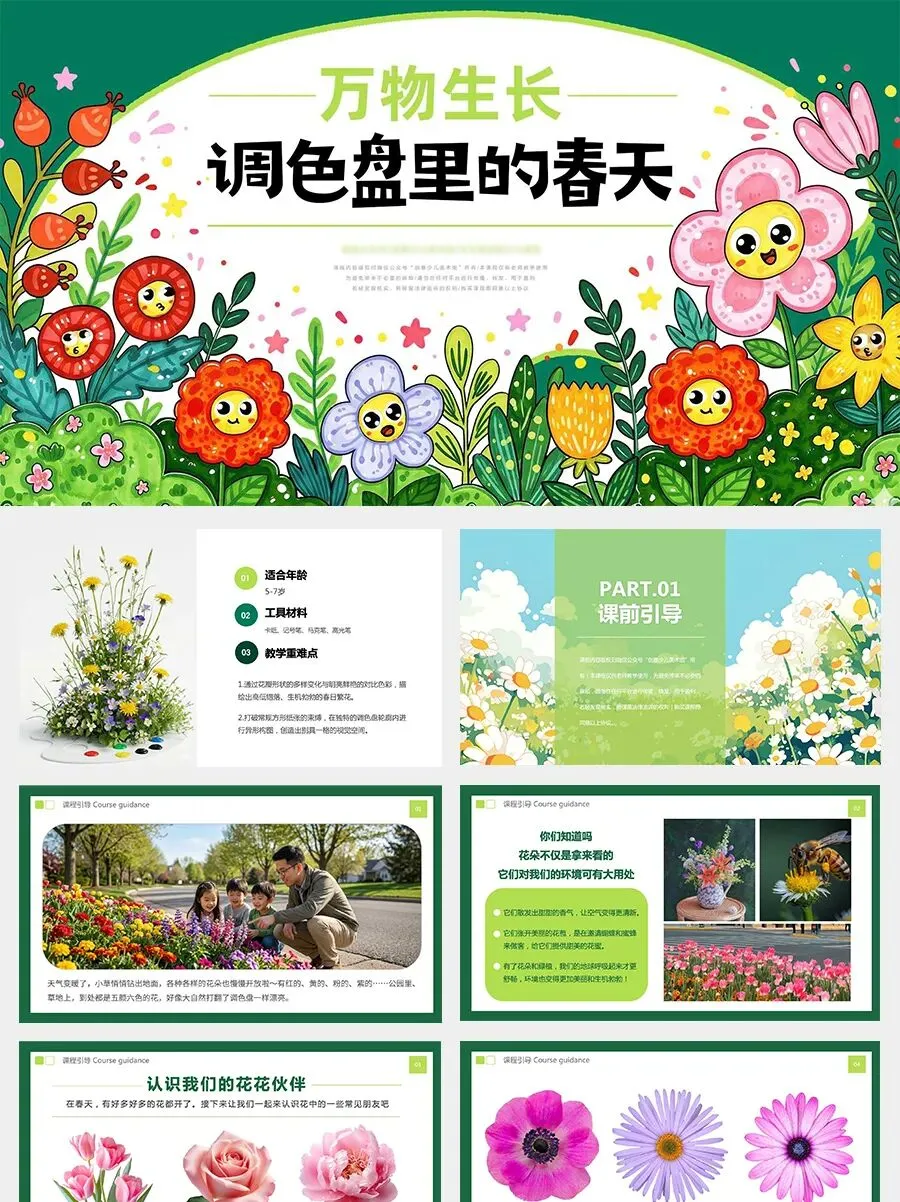 小朋友们,春天来了,大自然就像打翻了一块五彩缤纷的调色盘,红的、黄的、粉的、紫的……各种各样的花朵悄悄绽放,把草地和公园装扮得五颜六色,变得格外美丽。那这些花是不是都长得一样呢?