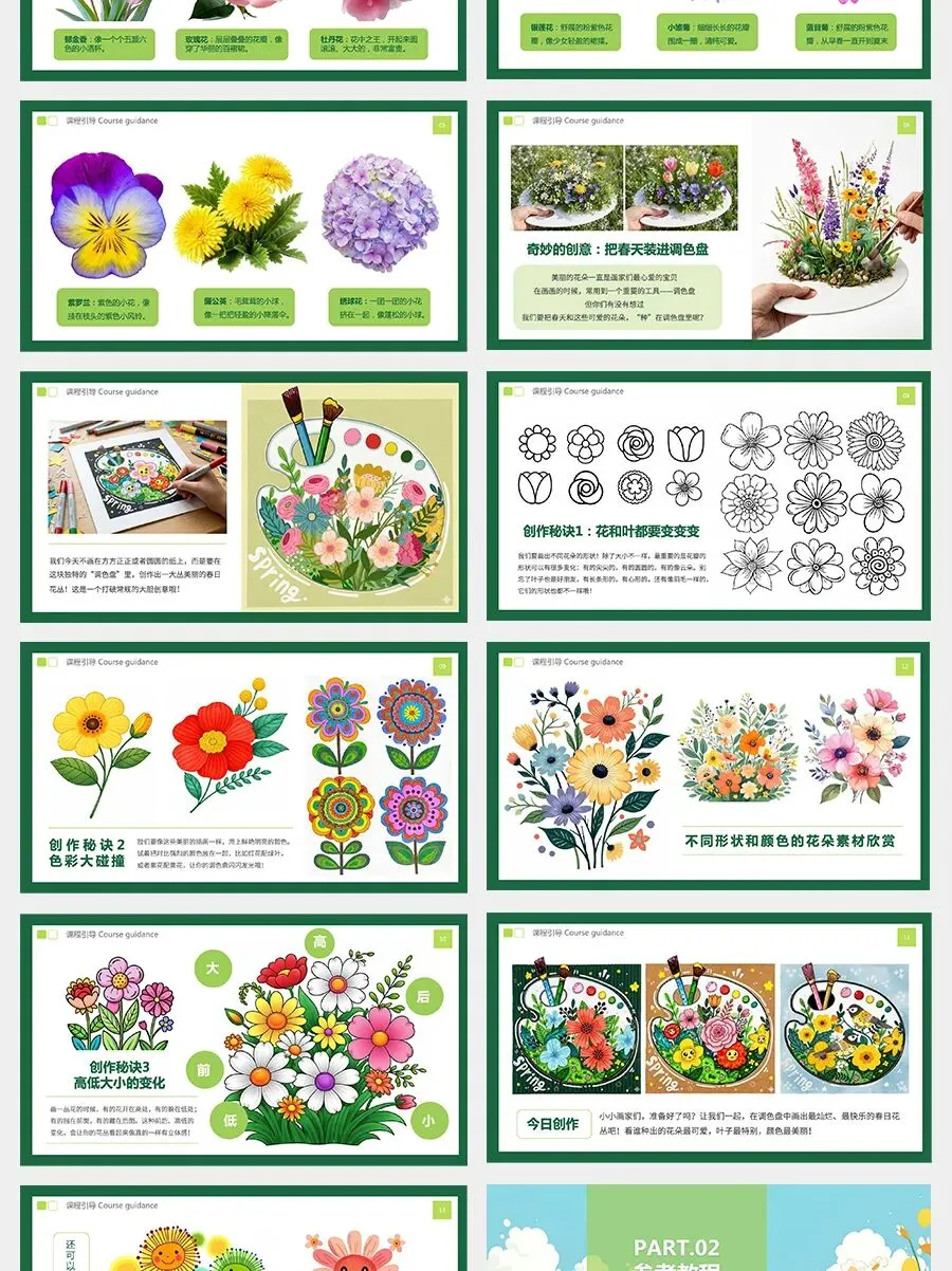 当然不是!有的圆圆的,有的尖尖的;有的花瓣一层一层地叠在一起,有的只有简简单单的几片。不仅形状不同,颜色也各不相同,有明亮鲜艳的,也有柔和清新的,还有对比强烈、特别醒目的搭配,每一朵花都有自己的小特点。这么多美丽又特别的花,如果把它们都收集起来,会不会变成一个神奇的小花园呢?