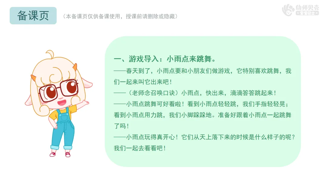 ——小雨点跳舞可好看啦!看到小雨点轻轻跳,我们手指轻轻晃;看到小雨点用力跳,我们小脚跺跺地。准备好跟着小雨点一起跳舞了吗!
