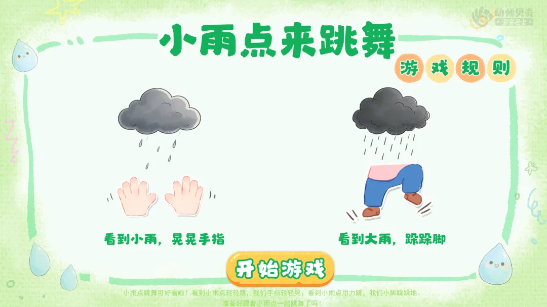 ——春天到了,小雨点要和小朋友们做游戏,它特别喜欢跳舞,我们一起来叫它出来吧!