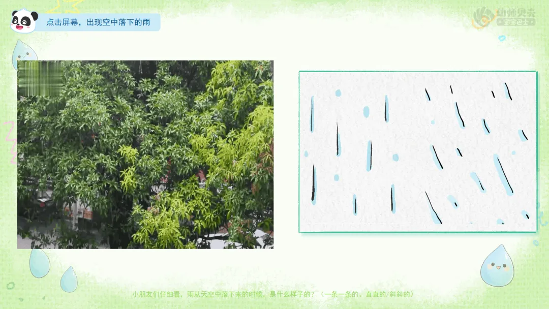 ——小朋友们仔细看,雨从天空中落下来的时候,是什么样子的?(一条一条的、直直的/斜斜的)