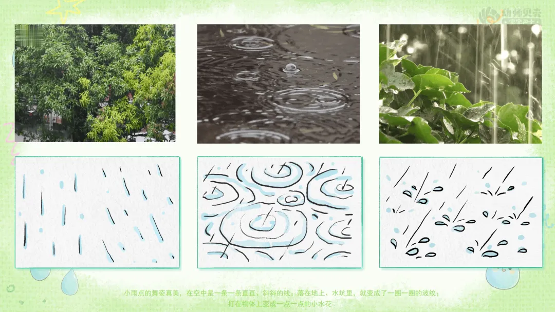 小结:小雨点的舞姿真美,在空中是一条一条直直、斜斜的线;落在地上、水坑里,就变成了一圈一圈的波纹;打在物体上变成一点一点的小水花。