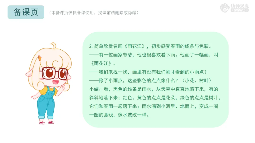小结:看,黑色的线条是雨水,从天空中直直地落下来,有的斜斜地落下来;红色、黄色的点点是花朵,绿色的点点是树叶,它们和春雨一起落下来;雨水滴到小河里、地面上,变成一圈一圈的弧线,像水波纹一样。