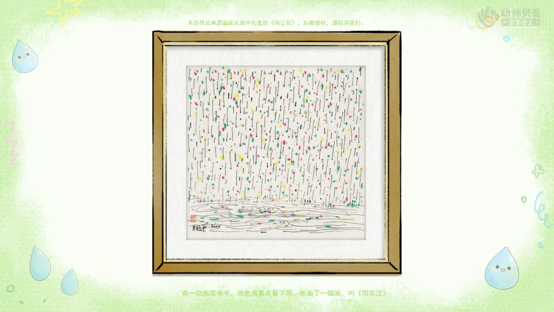 ——有一位画家爷爷,他也很喜欢看下雨。他画了一幅画,叫《雨花江》。