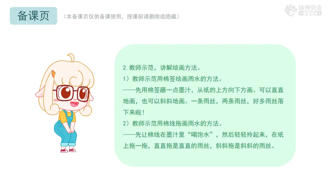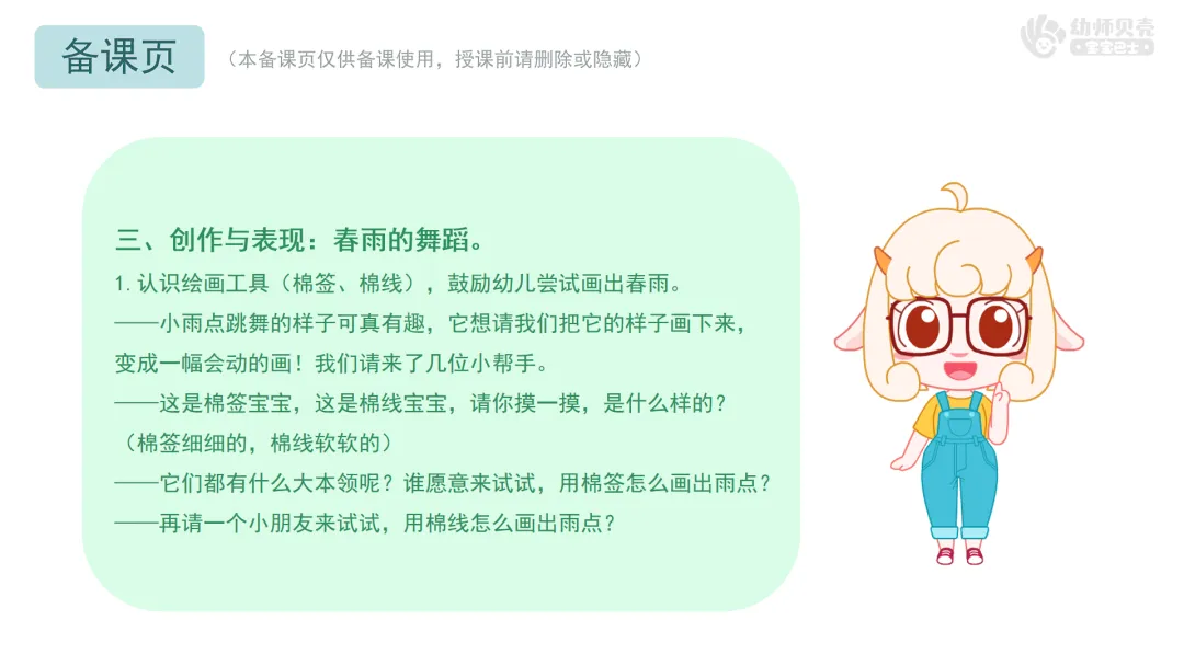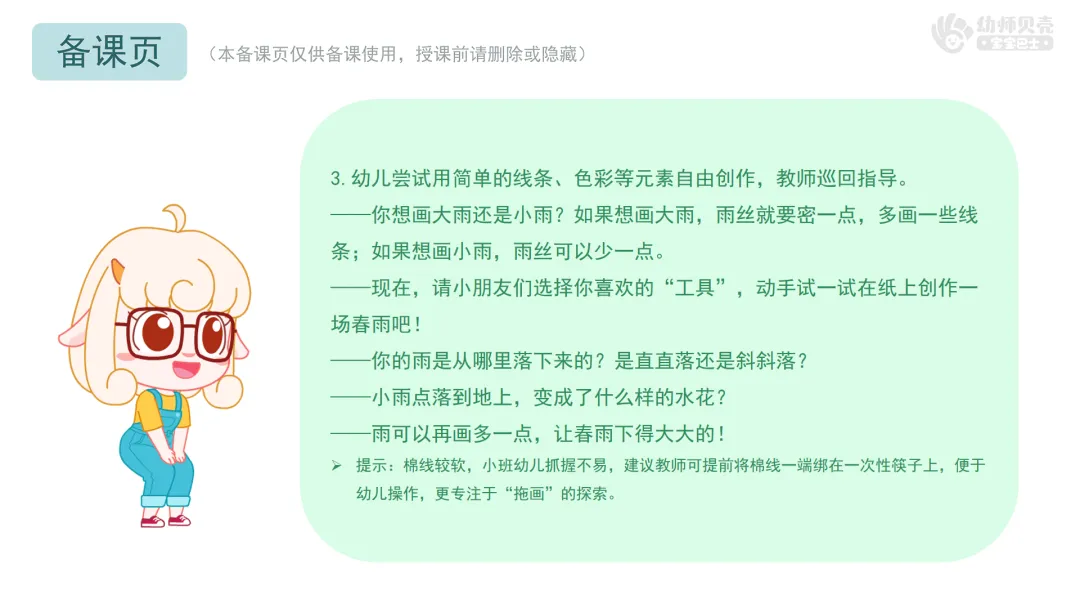 l难点:尝试控制棉签/棉线,在纸上拖画/点画出简单的线条、色彩表现春雨的自然美景。