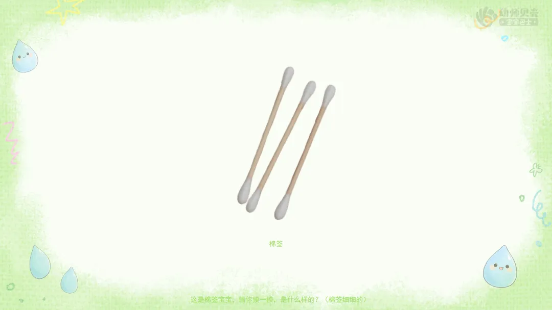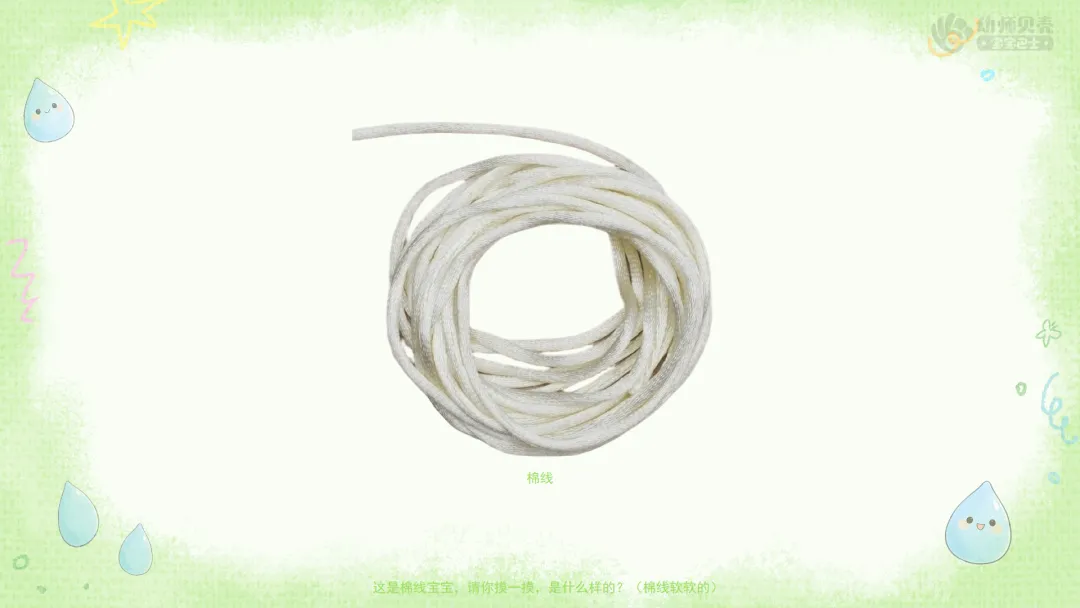 ——这是棉签宝宝,这是棉线宝宝,请你摸一摸,是什么样的?(棉签细细的,棉线软软的)