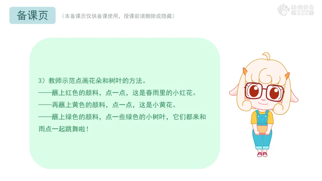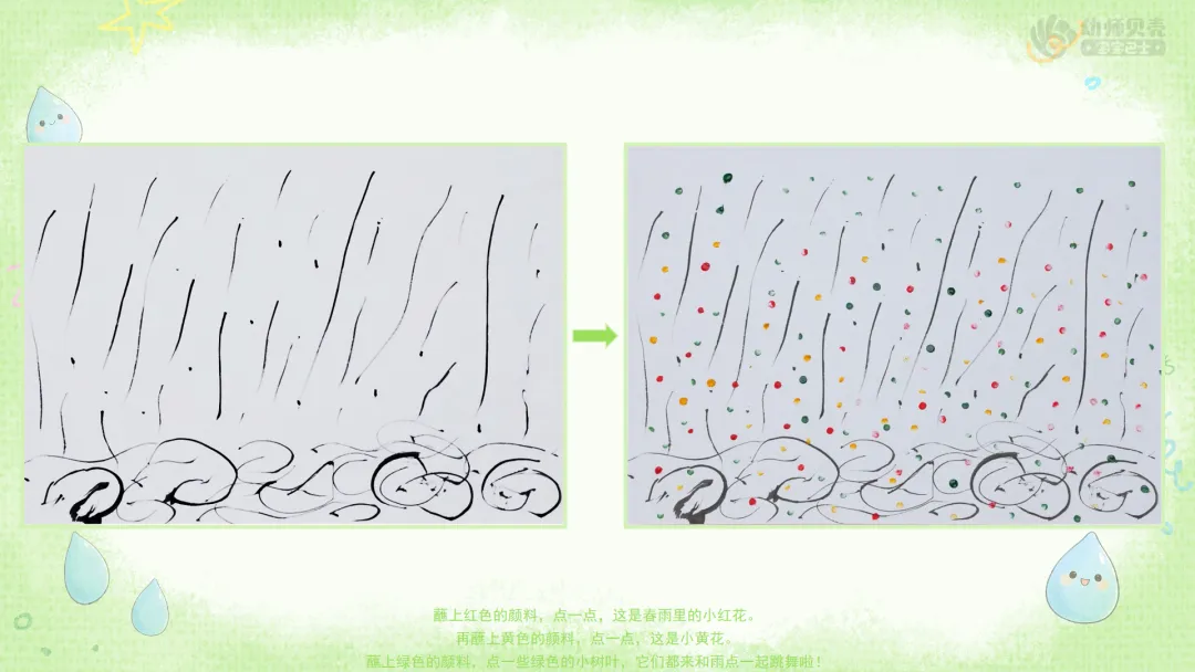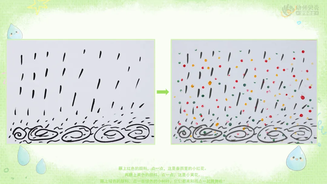 ——蘸上绿色的颜料,点一些绿色的小树叶,它们都来和雨点一起跳舞啦!