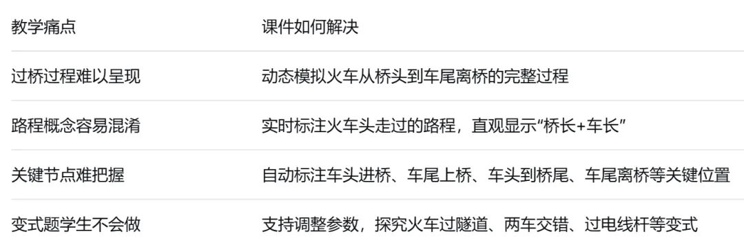 本课件精准回应一线数学教师在“列车过桥”教学中的4个常见难题: