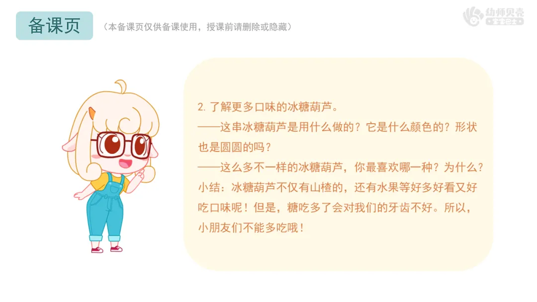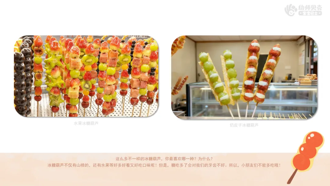 小结:冰糖葫芦不仅有山楂的,还有水果、山药豆等好多好看又好吃口味呢!但是,糖吃多了会对我们的牙齿不好。所以,小朋友们不能多吃哦!