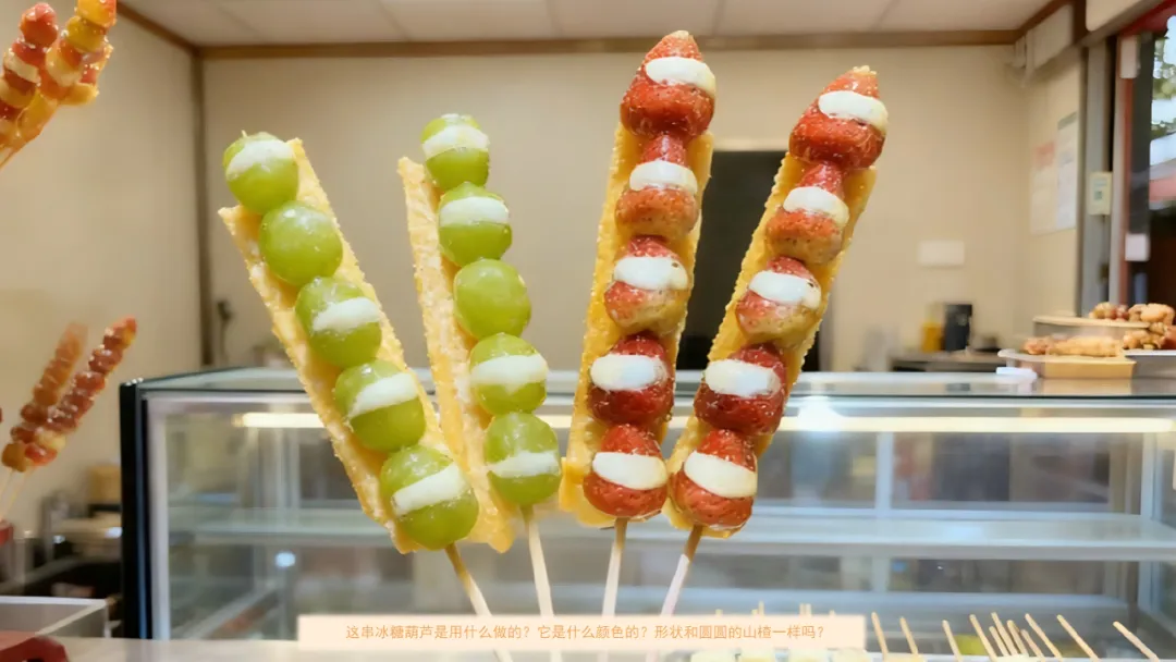 ——这串冰糖葫芦是用什么做的?它是什么颜色的?形状也是圆圆的吗?