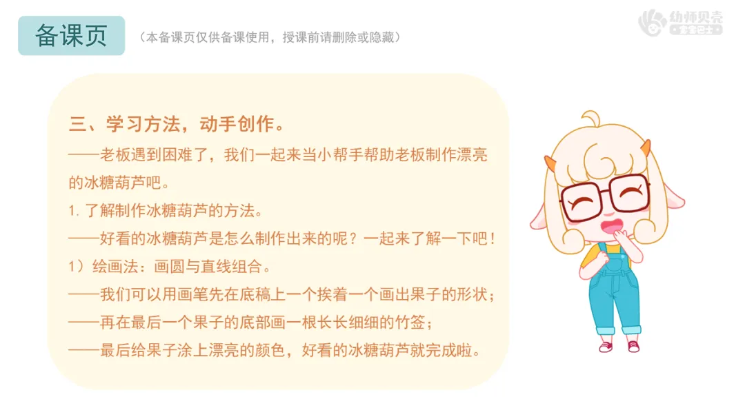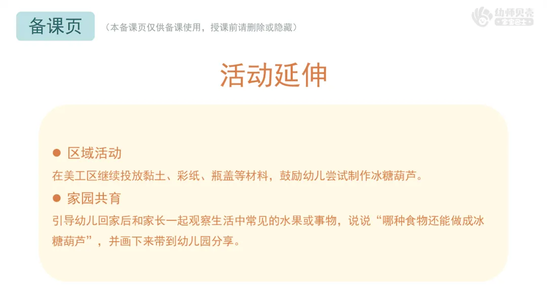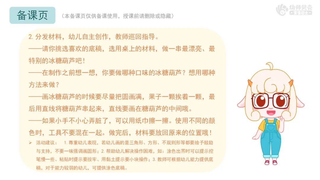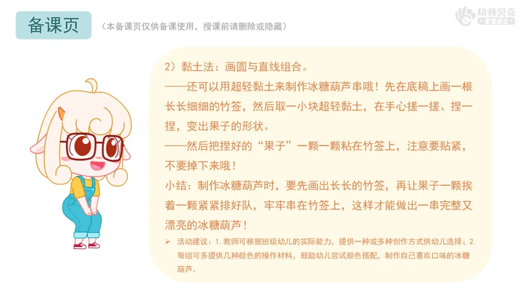 Ø活动建议:1.教师可根据班级幼儿的实际能力,提供一种或多种创作方式供幼儿选择;2.每组可多提供几种颜色的操作材料,鼓励幼儿尝试颜色搭配,制作自己喜欢口味的冰糖葫芦。