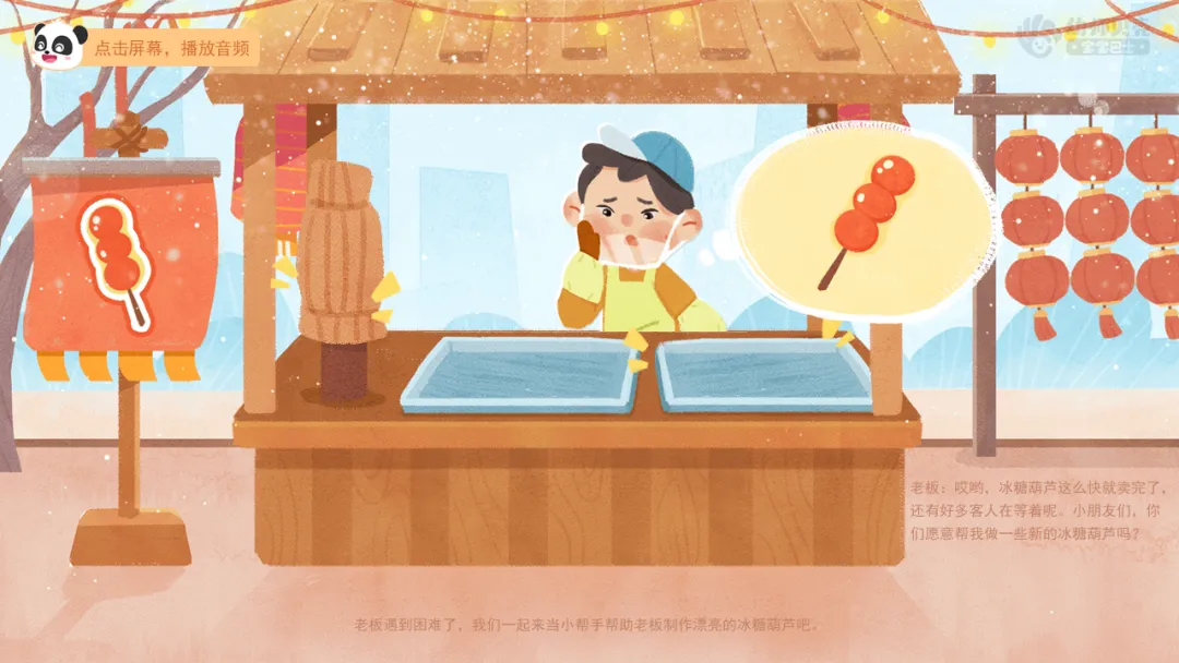 ——老板遇到困难了,我们一起来当小帮手帮助老板制作漂亮的冰糖葫芦吧。