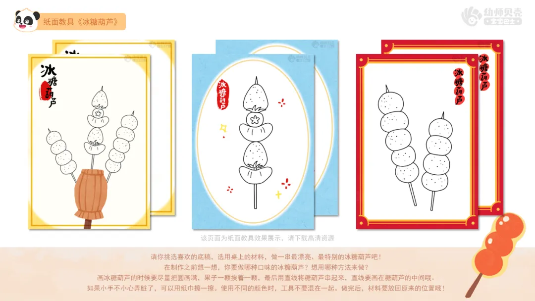 ——请你挑选喜欢的底稿,选用桌上的材料,做一串最漂亮、最特别的冰糖葫芦吧!