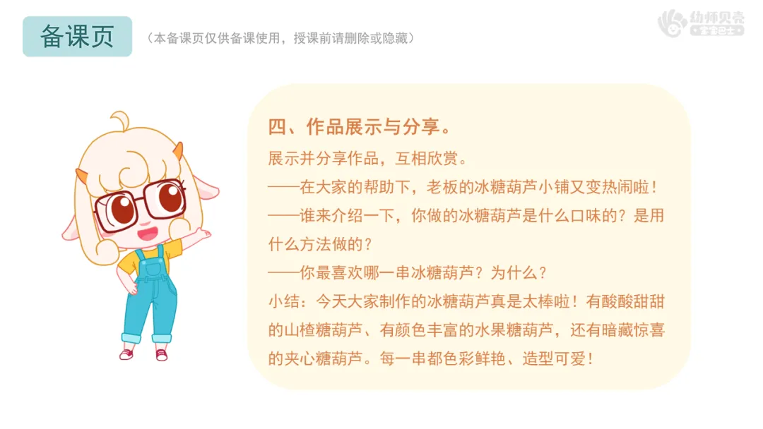小结:今天大家制作的冰糖葫芦真是太棒啦!有酸酸甜甜的山楂糖葫芦、有颜色丰富的水果糖葫芦,还有暗藏惊喜的夹心糖葫芦。每一串都色彩鲜艳、造型可爱!