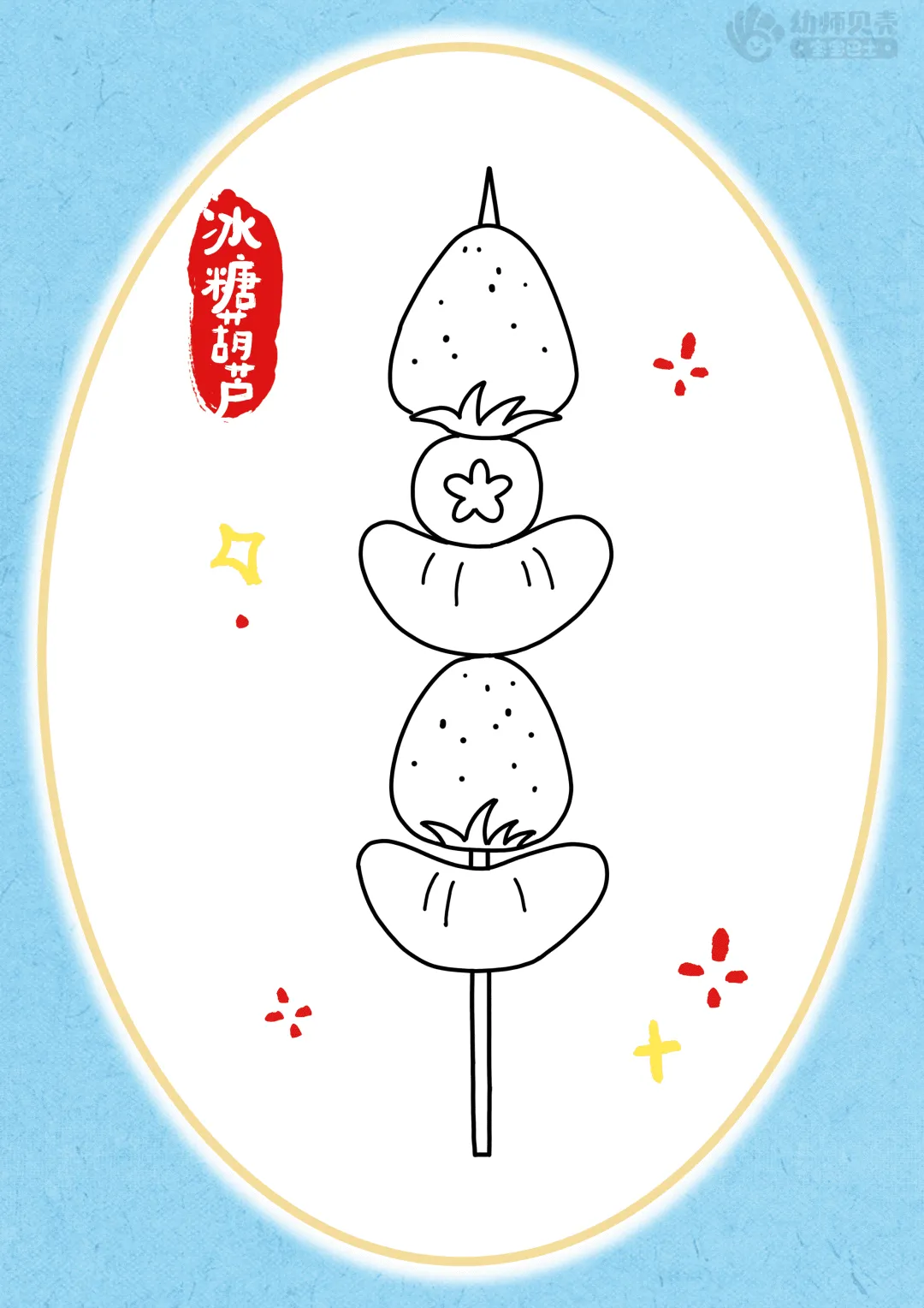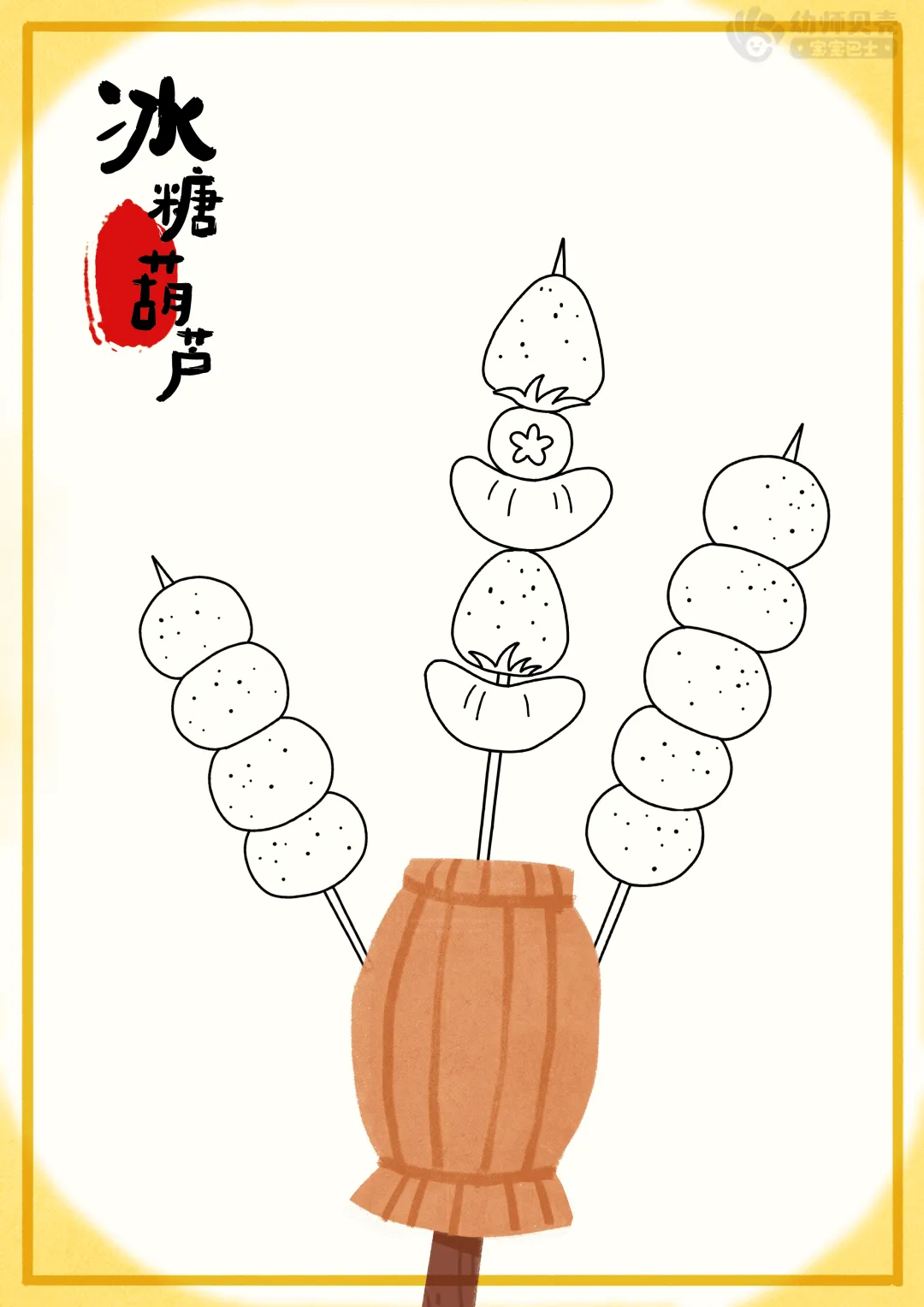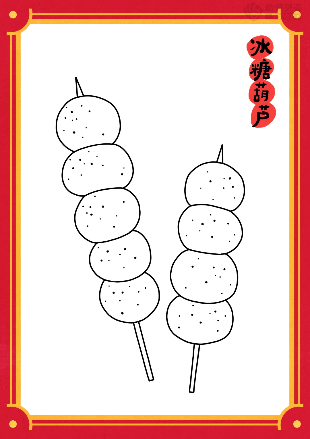 ——画冰糖葫芦的时候要尽量把圆画满,果子一颗挨着一颗,最后用直线将糖葫芦串起来,直线要画在糖葫芦的中间哦。