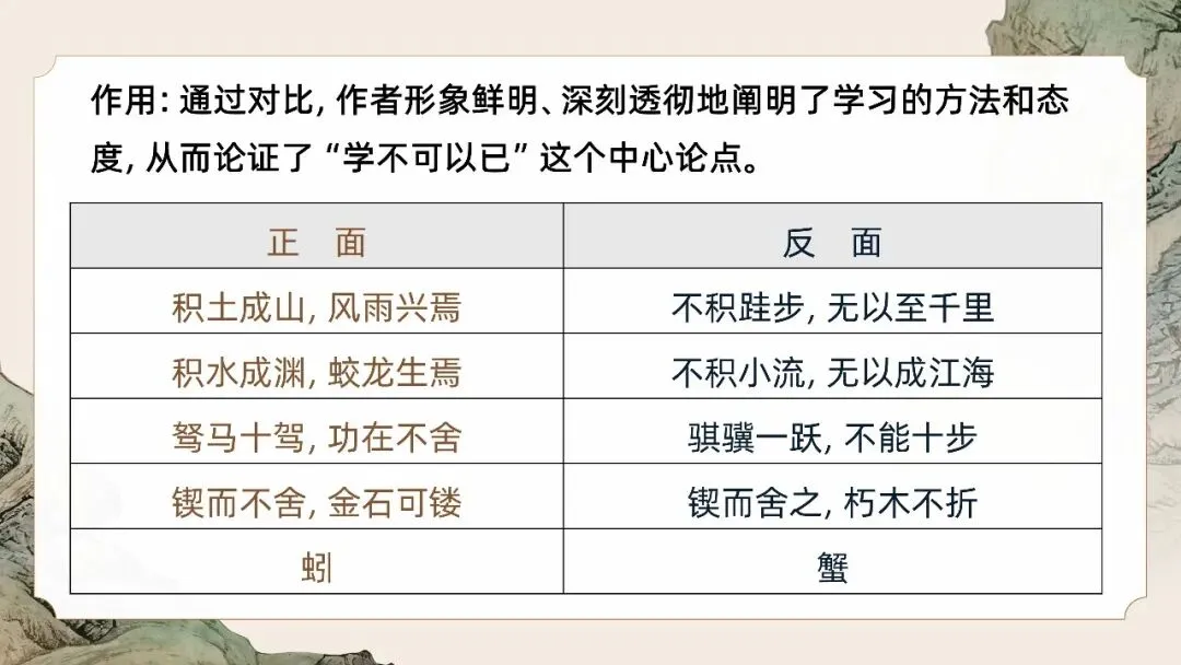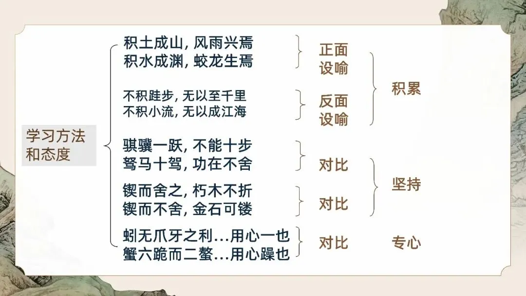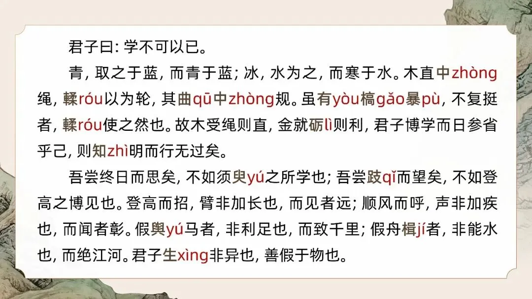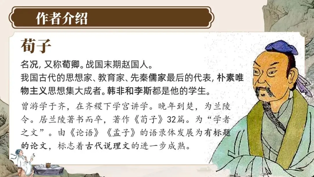 本文是《荀子》的开篇之作,为战国思想家荀子的论说文名篇。文章围绕"学不可以已"的中心论点,运用"青出于蓝""锲而不舍"等比喻,论证学习的意义、作用、方法与态度,强调积累、坚持、专一的重要性。全文说理透彻,结构严谨,比喻生动,"不积跬步,无以至千里"等句流传千古,是先秦儒家教育思想的经典文献,至今仍具深刻启示意义。