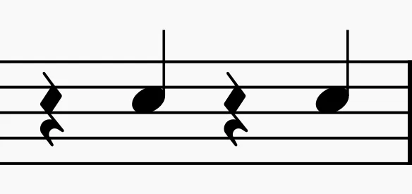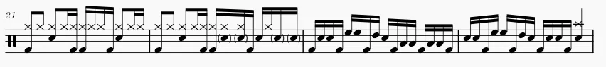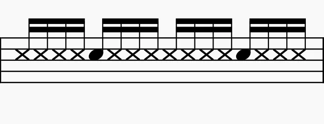 为什么不直接分析节奏型或乐句,因为这是别人说的话,如果我们一直模仿别人的话,思维容易固化。我们目前心中这个概念就行了,接下来要做的就是刻意练习、积累、思考。学习一种语言的最好方法是生活在当前语言日常化的环境之下,很可惜,作为一门乐器,我们大部分人并没有这个环境,甚至可以说,学乐器时有一大半时间都是孤僻的。如这张表格所示,我列举了常用风格律动的基本形态(实际运用中,会有大量的混合和变形),他们各自都有很明显的特点,但是重音大部分都围绕在2、4拍。我们以此为基准来构筑自己的节奏型和乐句,就能说出我们想要讲的这句话的基本意思。初期尝试,我们先以军鼓在2、4正拍上去创作,来诞生无限可能。先自己大胆创作,无论是难听还是好听,无论是耳熟还是陌生。设计构筑,10条军鼓在2、4正拍的一小节节奏或节奏型。每多运用一个声部+1分,最多5分。(H.H,B.D,Ried,Tom,C.C)每有一拍节奏不相同+1分,全部不同+1分,最多5分。每多运用一个技巧+1分,最多5分。(双跳\复合跳、重音移位、底鼓双跳、强弱、鬼音、休止)除去那5分的自我评判,尽量往15分靠,这是即兴思路的一步,不要担心过于复杂或者没有音乐性,我们目前要做的就是加法。不要在纸面上写好再演练,而是一边想,一边打,可以最后再写到纸面上。如果一口气想四拍太难,可以一拍一拍想,但一定是边想边打。初次完成10条后,相信学生目前对这10条绝对是熟记于心,因为这是他自己说的话,自己的语言。然后再分析这10条的优缺点,以及经常会出现在哪些地方或者哪些曲目有类似节奏(如果可能的话),这一点最好是有位老师能够指点。设计构筑,5条以2、4拍军鼓为核心,采用复合跳形式的十六分音符一小节线性乐句。军鼓不要求一定在正拍第一拍,但2、4拍一定要有军鼓,且二者位置对称。如图所示,X代表任意部件,军鼓可以放在2、4任意X内。1,军鼓位置只是例子,不代表全小节只能有这两个军鼓。2,不要拘泥于四连音,5、6……等等连音构造均可。线性节奏是架子鼓演奏中的一种基础技巧,核心在于避免音符重叠。也就是同一时间只打一个部件。在构建过程中,可以脑袋放空,只盯着重音部位,凭感觉让手去跑,如果采用此法,那么复合跳的选择就尤为重要。通过此法即兴构造,可以初步掌握减少脑力消耗的桥段过渡。我们在第九课,就笼统的讲述过这个概念,那个时候只是种下一颗种子,不理解是正常的,现在我们要做的是让它开始发芽。之前即兴地目的,是为了更好的锻炼乐感,强迫自己动起来和听相关的音乐。动机:动机就是一个你能记住的、重复出现的节奏短句。怎么找动机:从你会的词汇里挑一个。复合跳、双跳、三连音、重音一条,都行。
