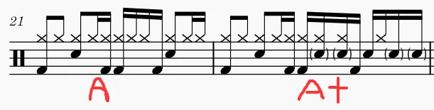 动机的前提:贴合整体音乐(无其他乐器的鼓独奏除外),有基础的律动逻辑。这一条,观察谱面不难看出,其重音位置也是在2、4拍,A+的动机变化,在后两拍添加了一些弱音军鼓。使得整体本身就很密的节奏,变得更密了,它要干什么?它要线性过鼓?!嗯……合理!通过不断堆高密度和强弱变化,让乐句产生推进感,为后续的爆发做铺垫是一个很好的选择。发展:选择一个关键元素,军鼓重音、底鼓位置、或指法规律、重音弱音规律,大胆的说你想炫耀的宣言。这就是SOLO。A与A+铺垫好走向B的路,B说出想要说的话。鼓上即兴没有旋律乐器那么多话说话,毕竟我们没有音高旋律,我们要做的就是运营好我们自己的单词、语法、语感。掌握了这些,往后即兴SOLO都不会太差,不至于一点思路都没有。1. 重复