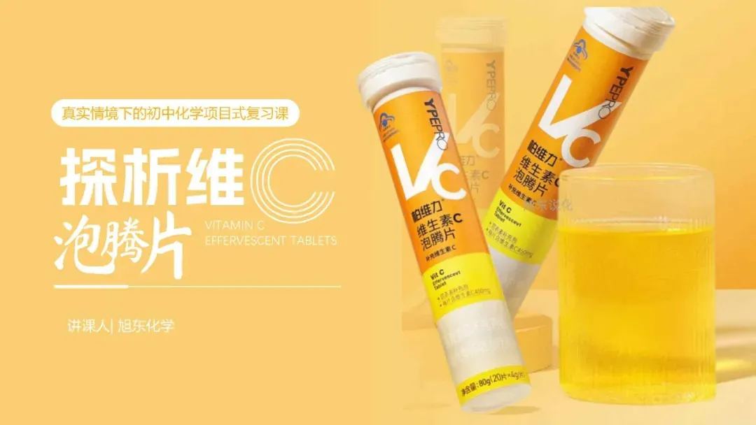 播放维 C 泡腾片广告视频,展示泡腾片泡水产生大量气泡的场景,提出问题:“天气转冷时,很多人会喝维 C 泡腾片预防感冒,这种说法是否科学?泡腾片泡水时产生的大量气泡是什么气体?它的成分中藏着怎样的化学秘密?” 引出本节课主题:“探析维 C 泡腾片 —— 化学项目式复习”。