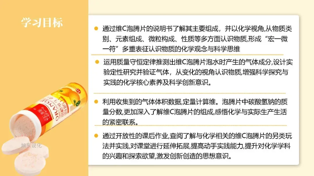 以生活化的健康话题切入,将抽象的化学知识与日常用品结合,快速吸引学生注意力,自然引出 “成分探究、气体检验、含量计算” 的核心任务。
