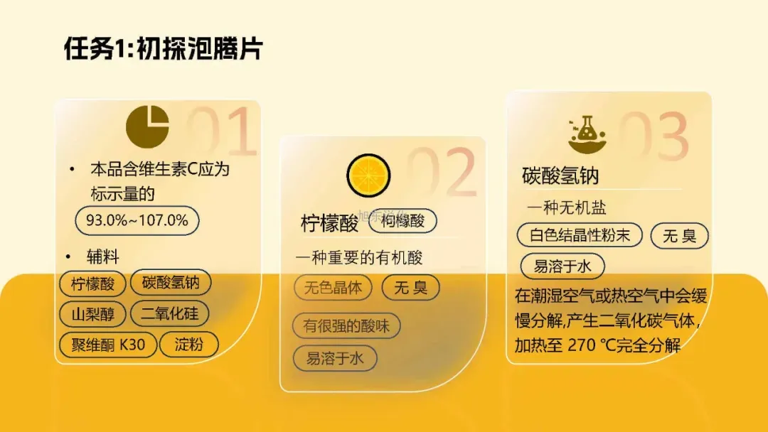 要解开维 C 泡腾片的化学秘密,首先要认识它的主要成分。根据说明书,泡腾片的核心辅料是柠檬酸和碳酸氢钠。接下来进入项目一:初探泡腾片 —— 定性认识核心成分。