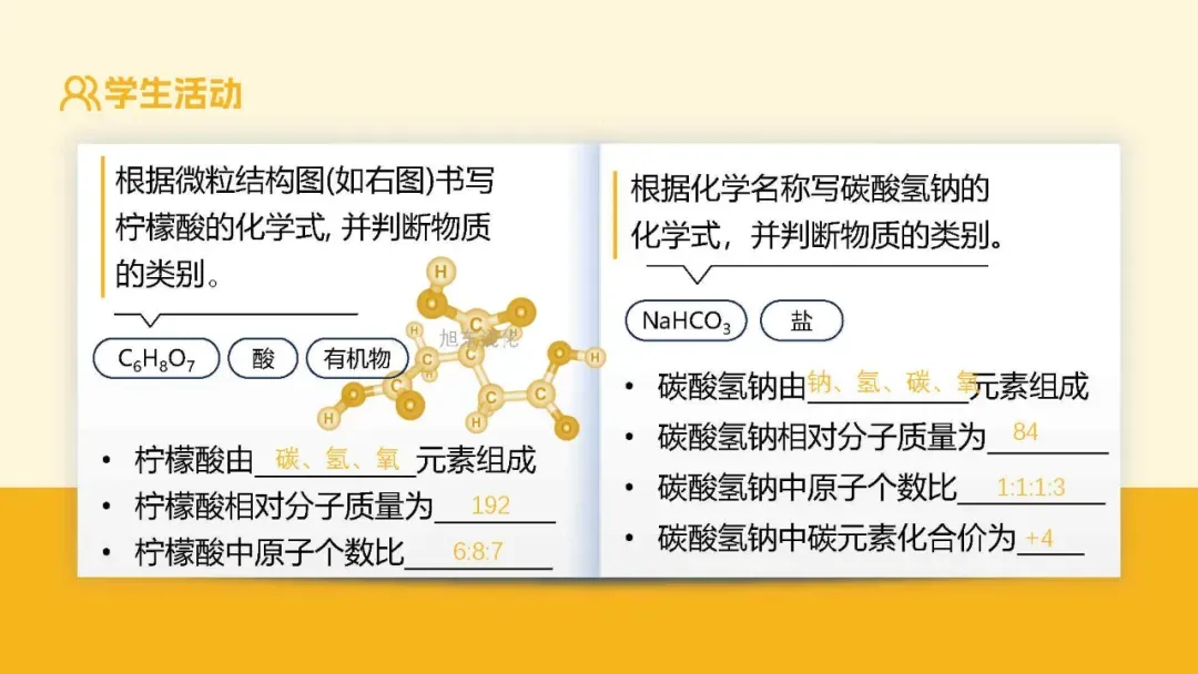 提供资料:“柠檬酸是重要的有机酸,其微粒结构图含 C、H、O 三种原子;碳酸氢钠是无机盐”,布置任务:“书写柠檬酸和碳酸氢钠的化学式,判断物质类别”。