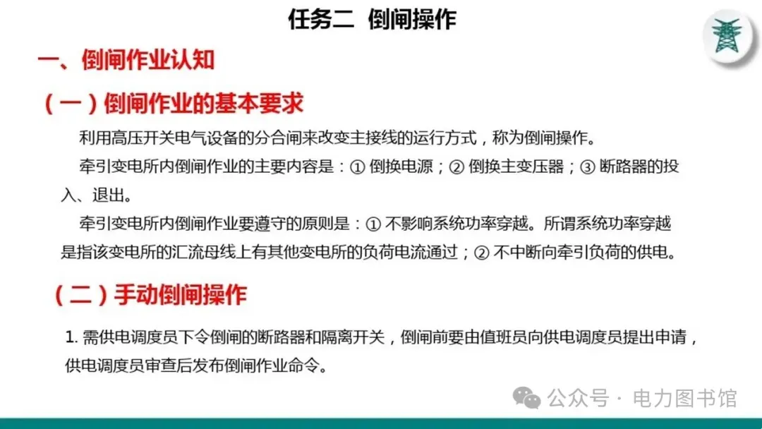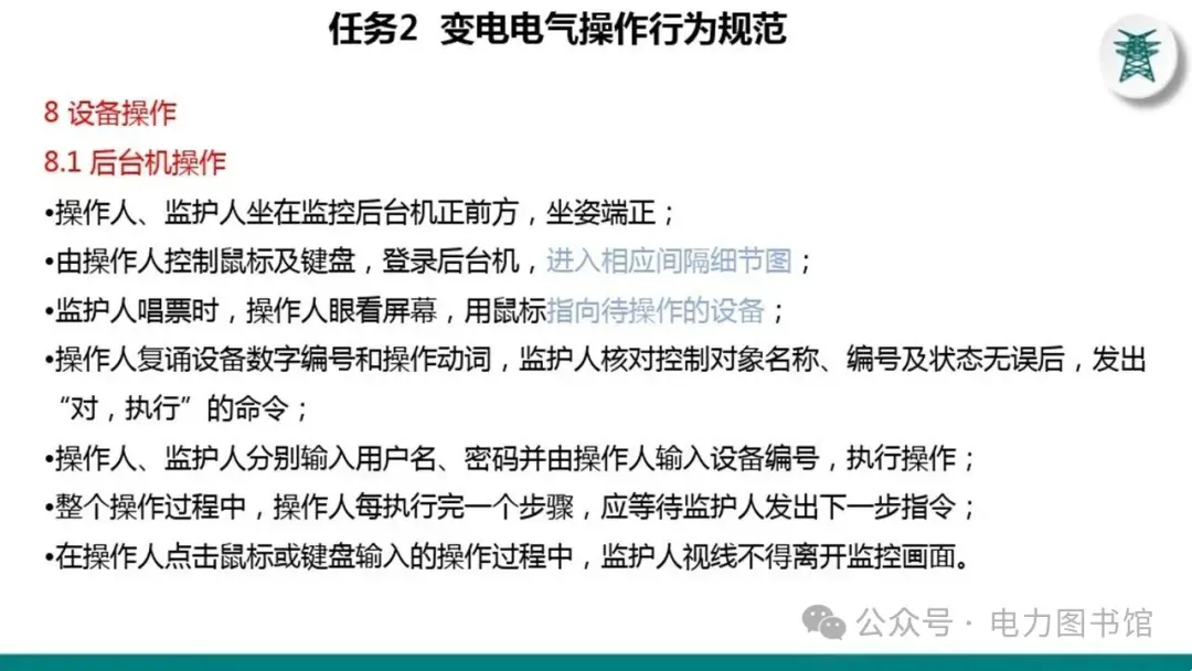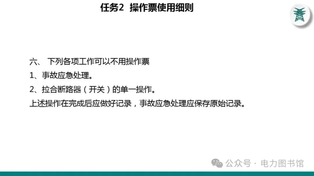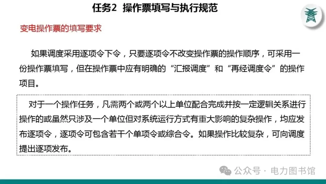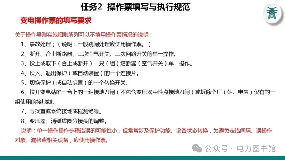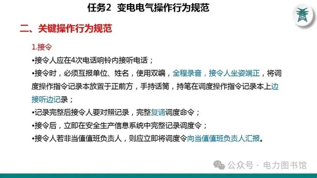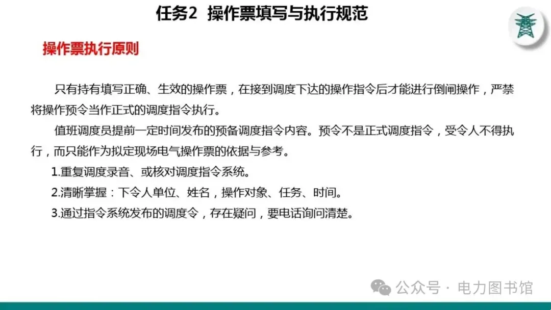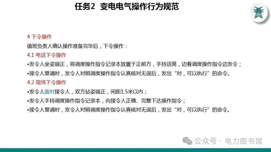 1.电气操作应根据调度指令进行(操作完毕,应及时汇报调度)。紧急情况下,为了迅速消除电气设备对人身和设备安全的直接威胁,或为了迅速处理事故、防止事故扩大、实施紧急避险等,允许不经调度许可执行操作,但事后应尽快向调度汇报,并说明操作的经过及原因。