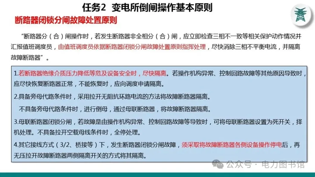 “断路器分(合)闸操作时,若发生断路器非全相分(合)闸,应立即检查三相不一致等相关保护动作情况并汇报值班调度员,由值班调度员依据断路器闭锁分闸故障处置原则指挥处理,尽快消除三相不平衡电流,并隔离故障断路器”。