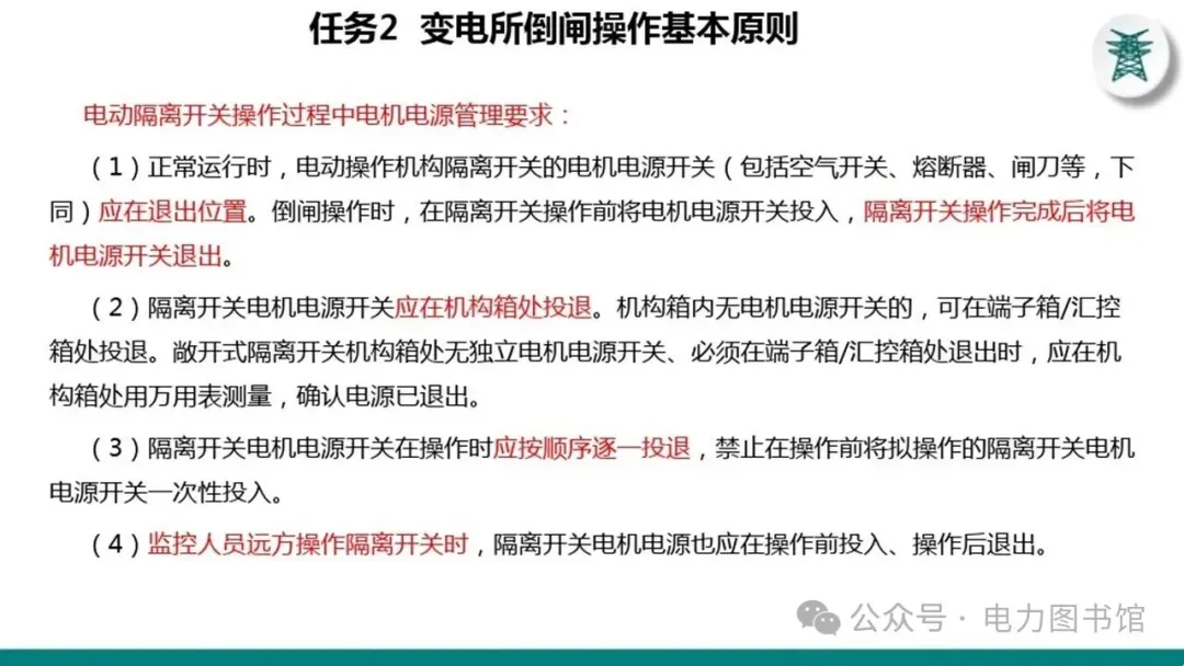 (1)正常运行时,电动操作机构隔离开关的电机电源开关(包括空气开关、熔断器、闸刀等,下同)应在退出位置。倒闸操作时,在隔离开关操作前将电机电源开关投入,隔离开关操作完成后将电机电源开关退出。