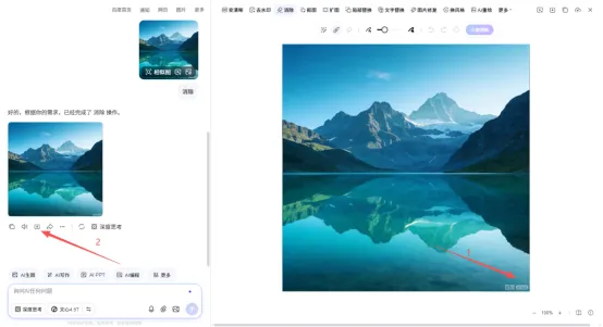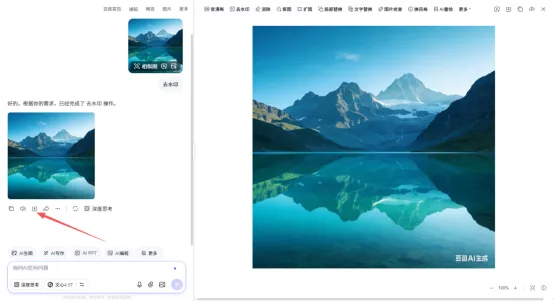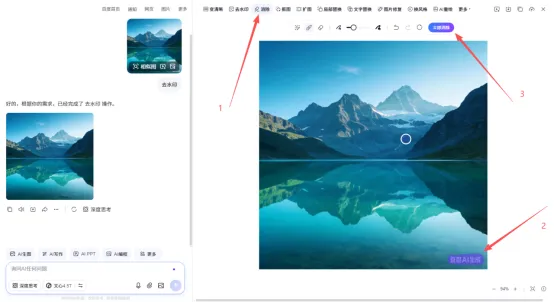 此时原有水印已去除,但可能生成新的百度水印。可将图片下载后,再次使用“AI去水印”功能处理即可,如下图所示: