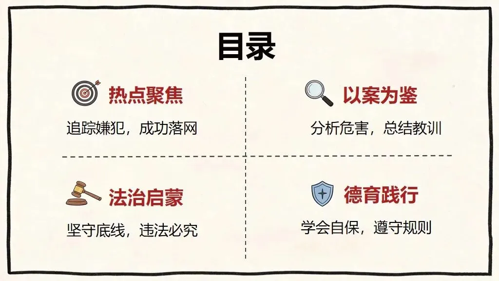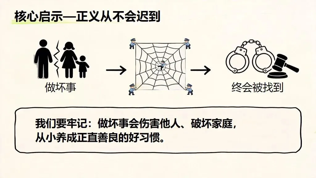 - 关联解读:法治与每一位少年儿童息息相关破除 “法治离我很远” 误区:法治是保护我们的 “安全伞”,也是约束犯罪的 “高压线”。违法必究、正义必达,无论犯罪隐藏多久,最终都要付出代价。法治守护成长,正义从不缺席。