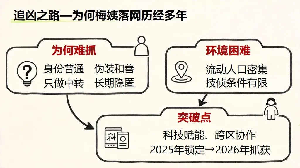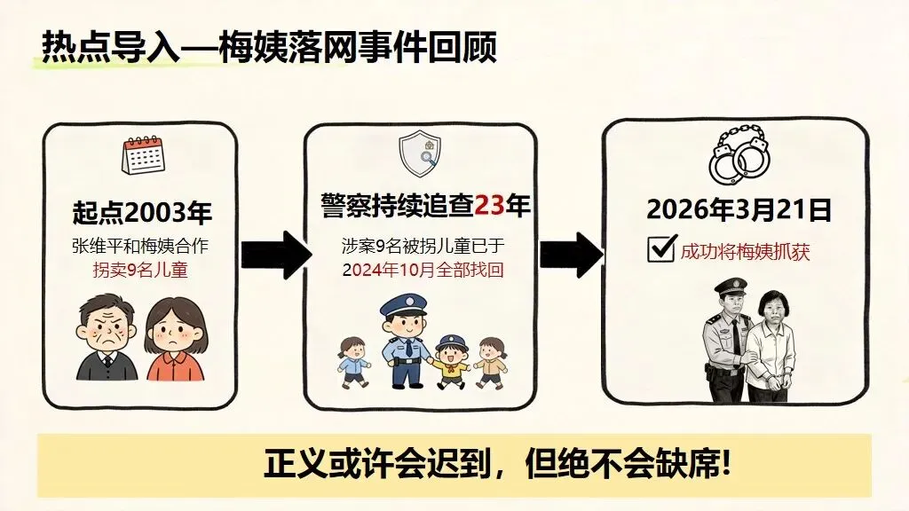 - 开篇设问:正义为何 23 年从不缺席?“梅姨” 谢某某涉嫌拐卖中转 9 名儿童,警方追查 23 年终于 2026 年抓获,9 名孩子全部回家。她长期伪装、隐蔽藏身、技术条件有限,导致追捕漫长,但警方从未放弃,彰显 “法网恢恢,疏而不漏”。