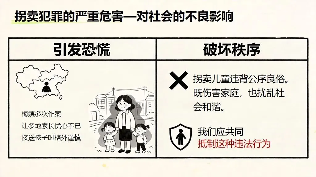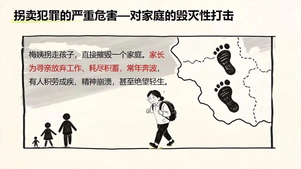 - 事件解析:拐卖犯罪带来的三重伤害拐卖儿童不是小事,而是毁灭性犯罪:对儿童造成终身心理创伤与成长缺失;对家庭导致破碎、倾家荡产、精神崩溃;对社会引发恐慌、破坏和谐稳定,危害极大、影响极深。