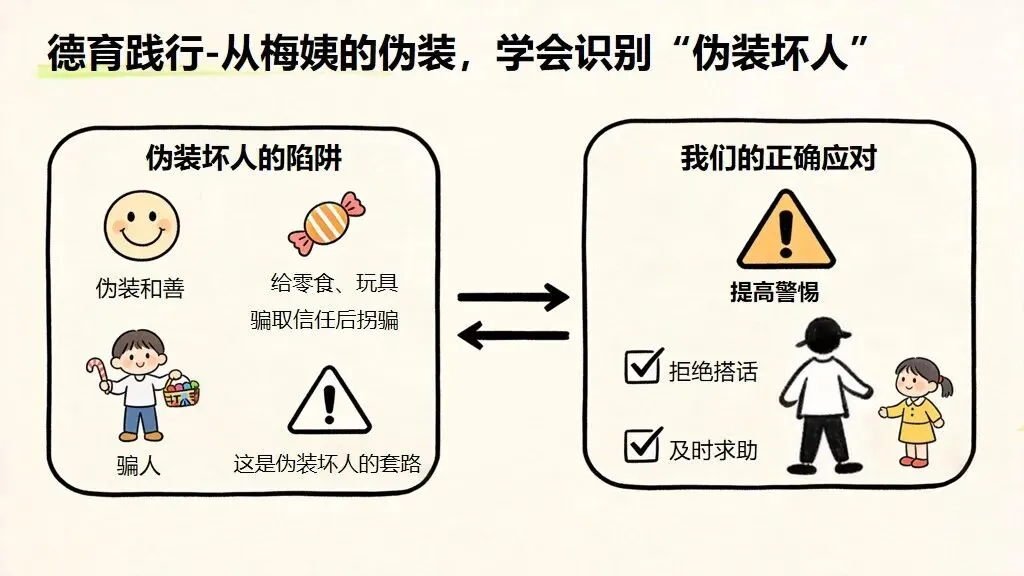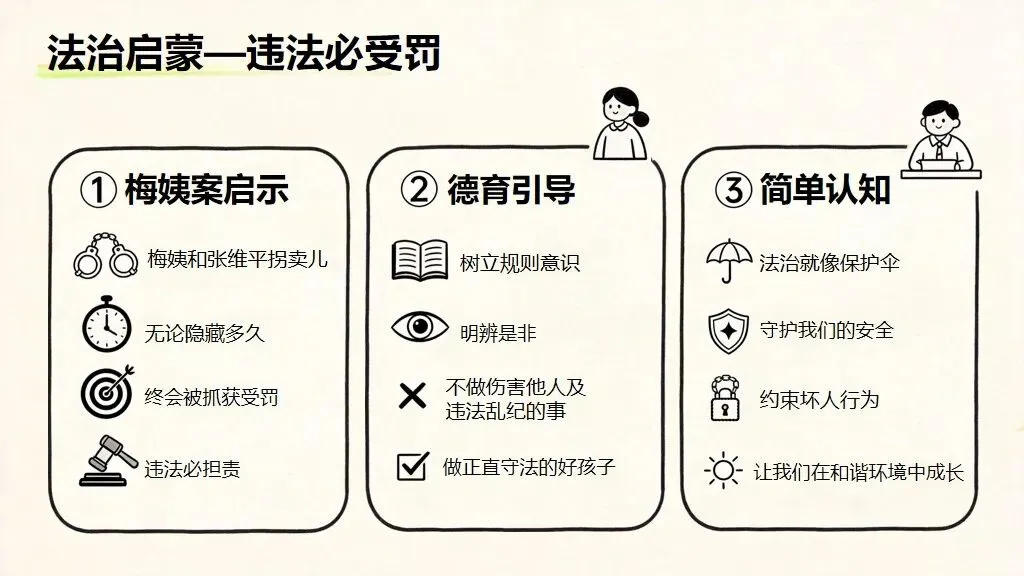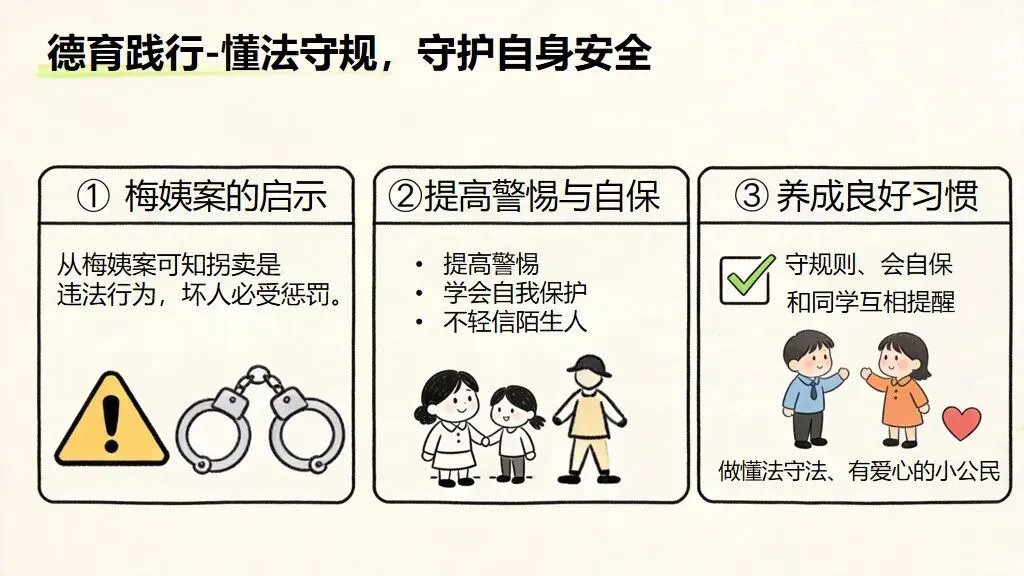 本课件以 梅姨落网真实法治热点为切入点,用 “热点设问 — 事件解析 — 关联自身 — 践行指南” 四步结构,把法治教育、防拐教育、德育教育融为一体,案例震撼、逻辑清晰、做法具体,小学生一听就懂、一学就会。