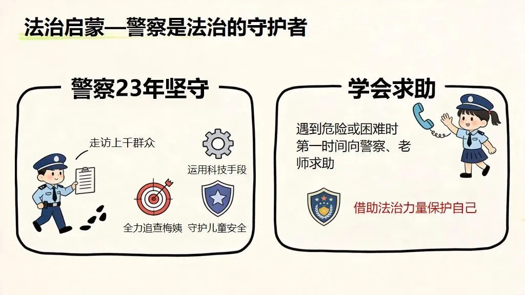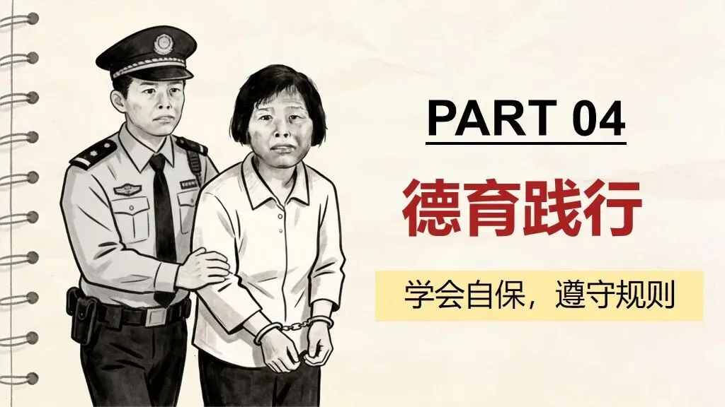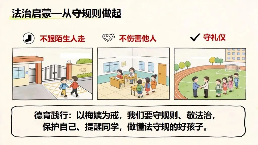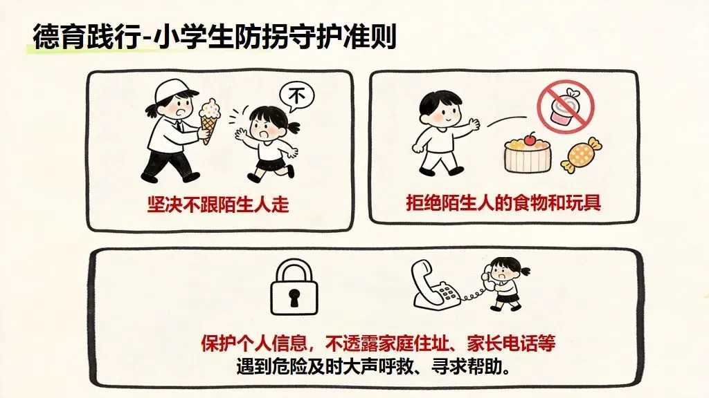 - 践行指南:守住底线、学会自保,做守法小公民牢记防拐 “三不”:不跟陌生人走、不吃陌生人东西、不泄露个人信息;警惕伪装友善的坏人;遇到危险及时呼救、求助警察老师;从小守规则、明是非,不做违法事,守护自己与他人安全。