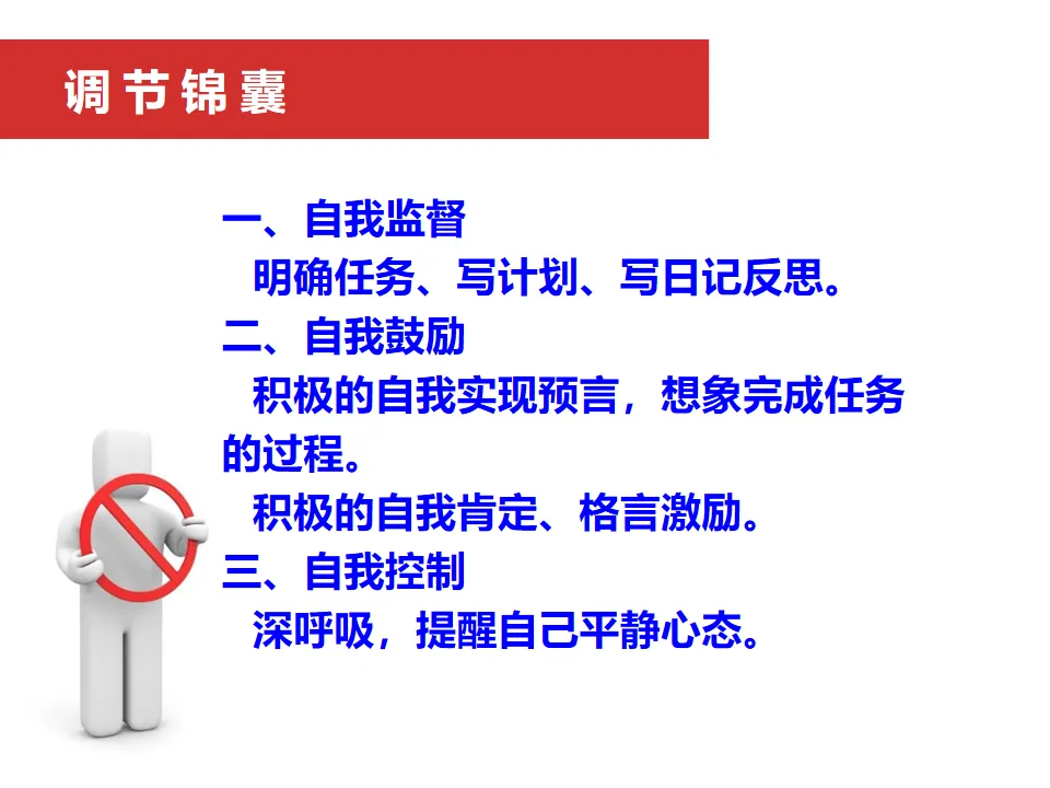 2、根据不同情况,分别制作自我监督锦囊、自我激励锦囊和自我控制锦囊。