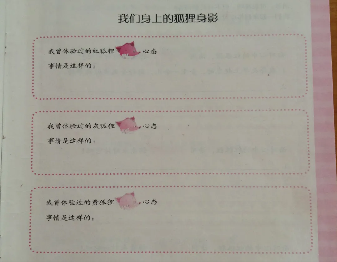 3、重复上述步骤,完成灰狐狸心态和黄狐狸心态的故事叙写。教师注意强调灰狐狸和黄狐狸心态的具体表现。